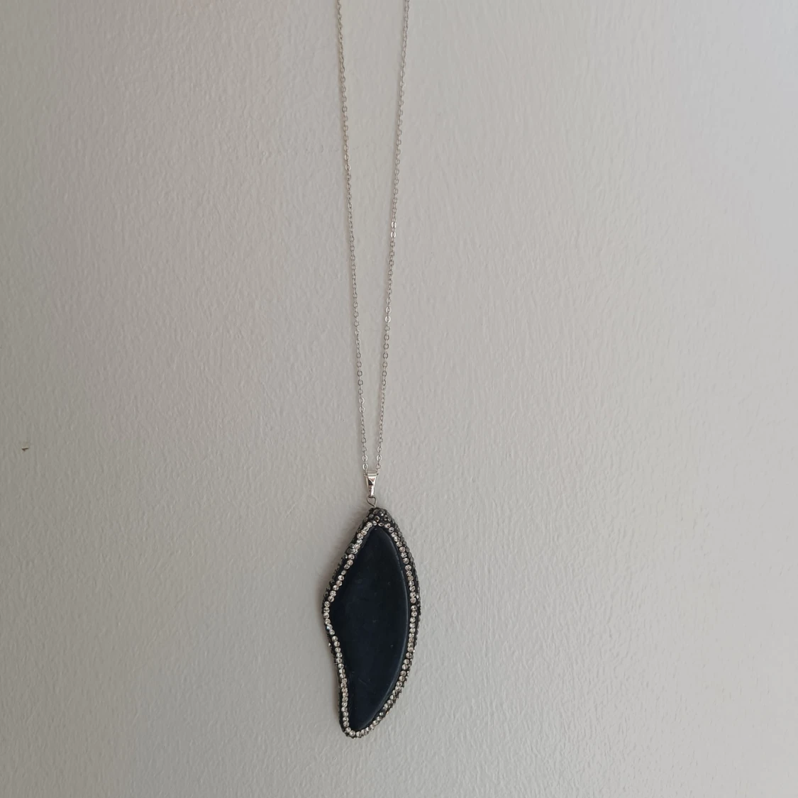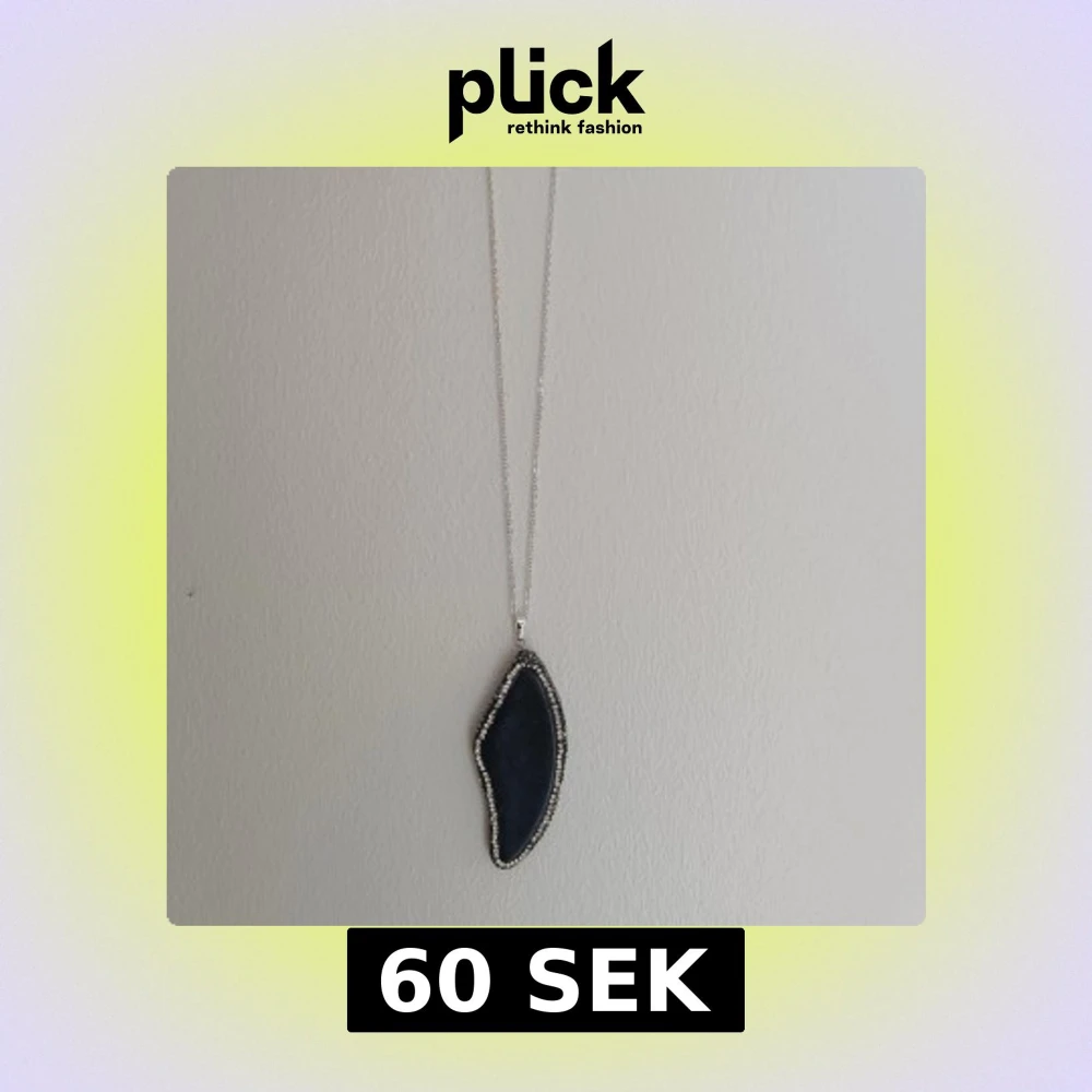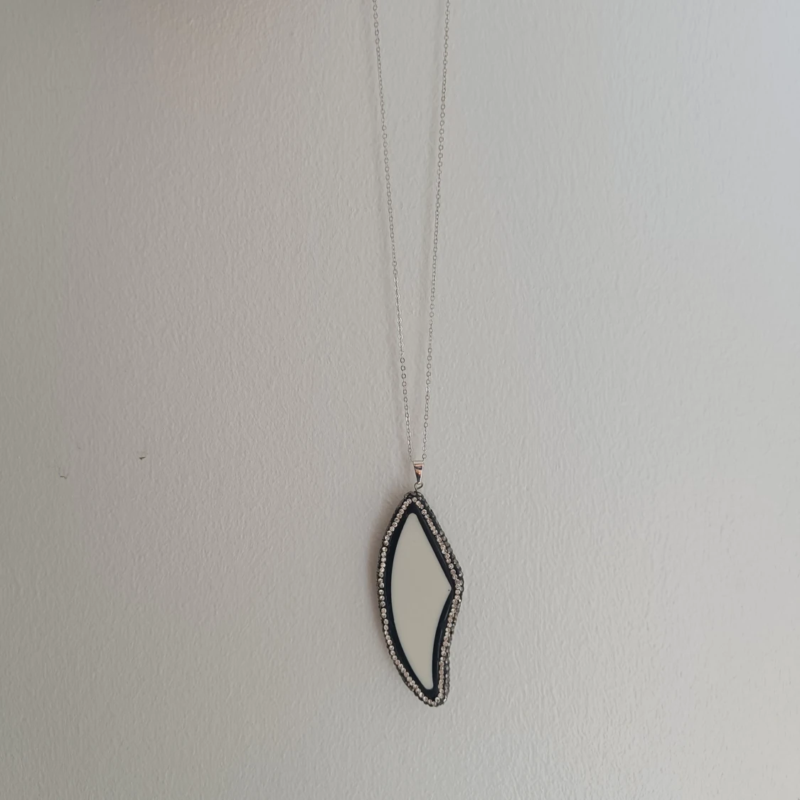 Unikt halsband med tunn silverkedja och coolt tvåsidigt hängsmycke. Ena sidan är svart och andra vit, båda omgivna av glittriga stenar som ger extra bling. Hängsmycket har en organisk, böljande form som sticker ut och gör halsbandet riktigt speciellt.
