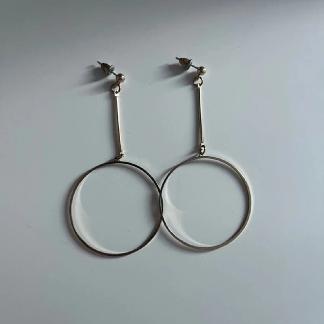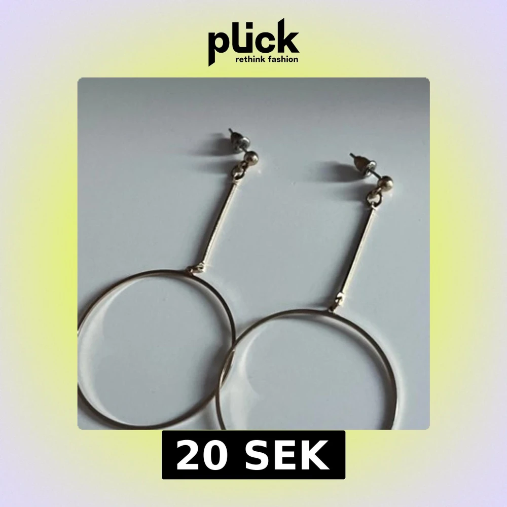 Säljer ett par stora, minimalistiska örhängen i silverfärgad metall. De har en tunn, rund cirkelformad design som hänger i en smal stav från örsnibben. Perfekta för dig som gillar stilrena och trendiga accessoarer.