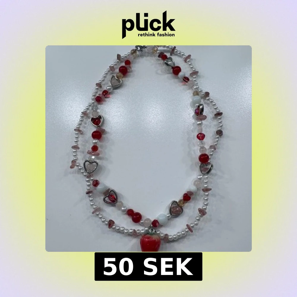 Dubbelradigt halsband med vita och röda pärlor, små stenar och silverfärgade hjärtan. Stort rött hjärta som hänge. Perfekt för dig som gillar färg och lekfulla detaljer.