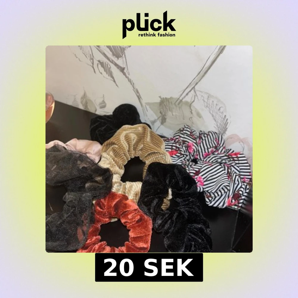 Säljer ett gäng scrunchies i olika material och färger. Du får en beige manchester, svart och röd sammet, svart mesh med prickar, ljusrosa satin och en randig vit/svart med blommor. Perfekt för att piffa upp din frisyr med coola detaljer.