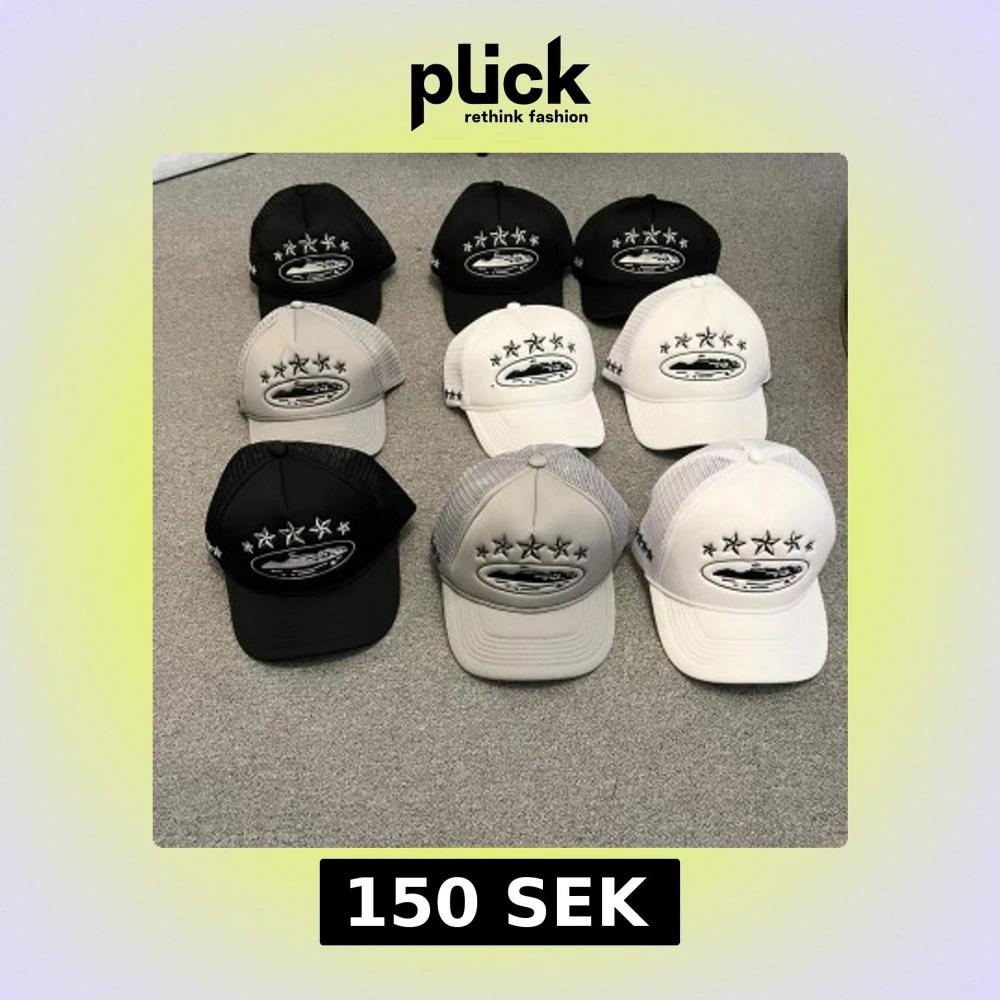 Snygga truckerkepsar i svart, grått och vitt med broderade stjärnor och ett ovalt motiv framtill. Kepsarna har mesh på sidorna och bak för extra ventilation. Justerbar passform och cool streetstil, perfekt för dig som vill sticka ut.
