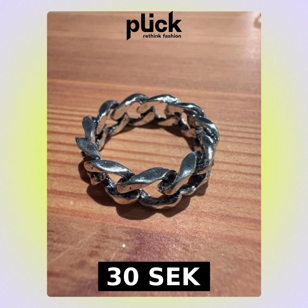 Säljer en cool ring i silverfärgat metall med kedjeformad design. Ringen har en chunky och robust look med flätade länkar runt hela bandet. Perfekt för dig som gillar statement-smycken med lite edge.