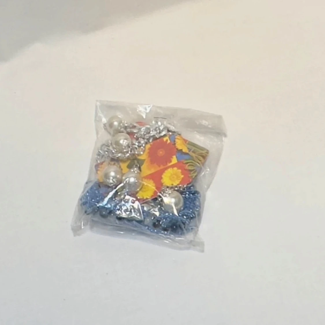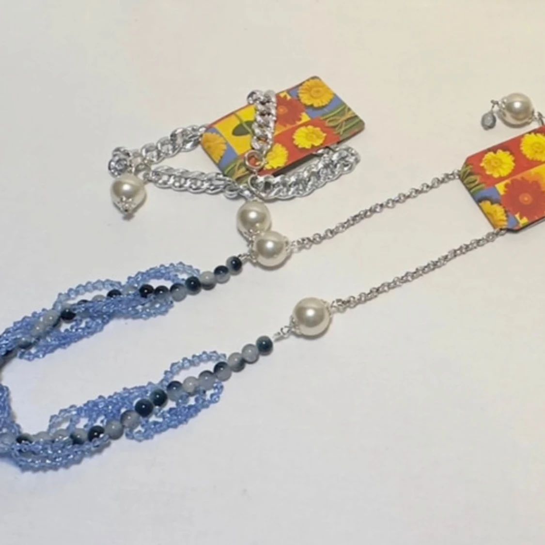 Snyggt smyckeset med halsband, armband och örhängen. Halsbandet har blå och silverfärgade pärlor i olika nyanser och storlekar. Armbandet och örhängena har stora vita pärlor och silverkedjor. Perfekt för att piffa upp en outfit till fest eller speciella tillfällen.Ett par örhängen och ett par armband plus en halsband handgjorda mycket mycket fint nytt oanvänd