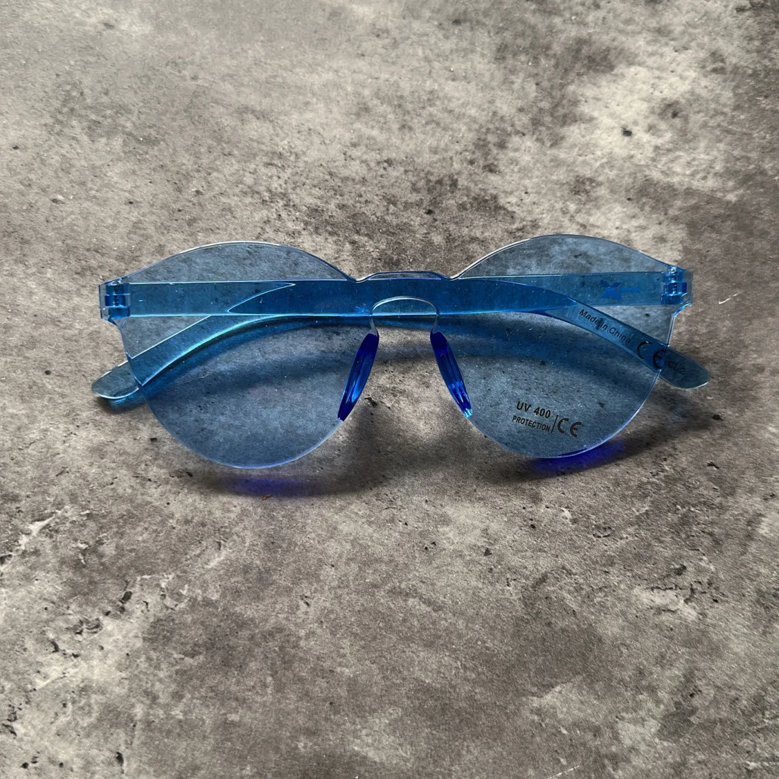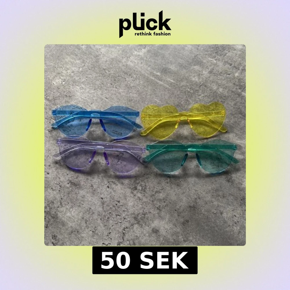 Fyra par solglasögon i transparent plast med olika färger: blå, lila, grön och gula hjärtformade. Alla har en modern, oversized look och coola färgade linser. Perfekta för att sticka ut och ge din outfit en lekfull vibe.