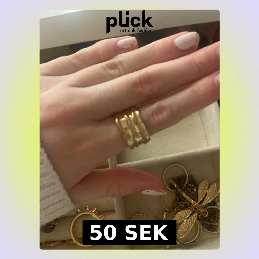 Säljer en bred guldfärgad ring med vågig och lite organisk form. Ringen har en chunky look och är helt slät utan stenar eller mönster. Perfekt för dig som gillar statement-smycken och vill ha något som sticker ut lite extra.