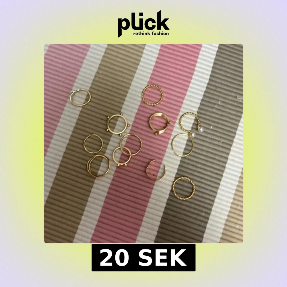Ett set av 12 guldiga ringar i olika stilar, inklusive tvinnade och släta designer. Vissa ringar har pärldetaljer och en har en stjärnformad design. Perfekt för att mixa och matcha för en personlig stil.