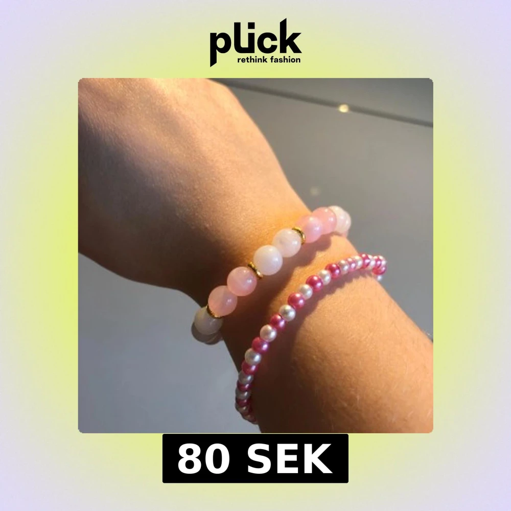 Två eleganta armband med pärlor. Det ena har större pärlor i rosa och vitt med små guldfärgade detaljer. Det andra är ett smalare armband med mindre rosa och vita pärlor. Perfekt för att lägga till en subtil färgklick till din outfit.