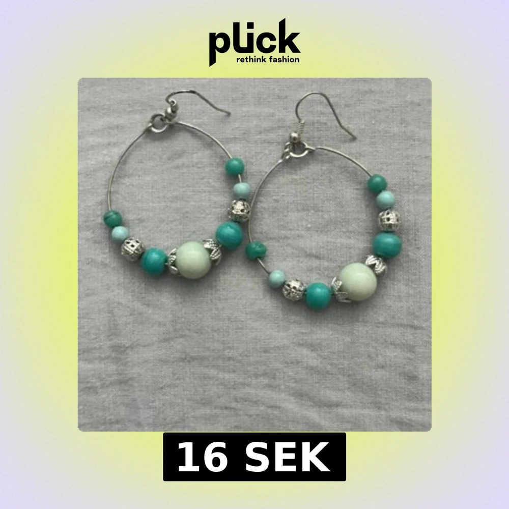 Säljer ett par stora, runda örhängen med turkosa och ljusgröna pärlor samt detaljerade silvriga pärlor. Örhängena har en cool boho-vibe och är perfekta för att ge din look lite extra färg. Metalltråd i silverfärg och pärlor i olika storlekar gör dem unika.