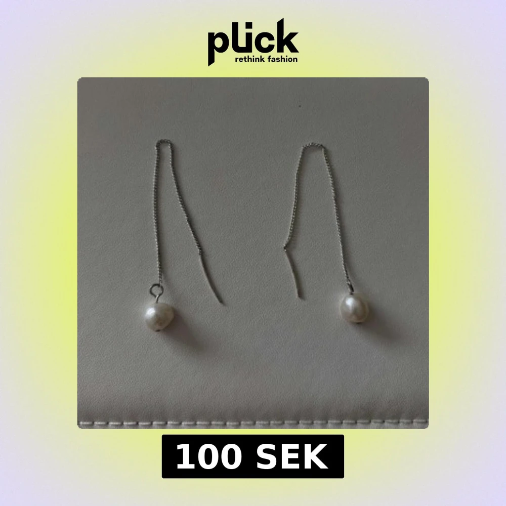 Säljer ett par tunna, silvriga trådörhängen med vita pärlor längst ner. Örhängena har minimalistisk design och ger en elegant look med sina hängande kedjor och runda pärlor. Perfekta för dig som gillar stilrena smycken med en twist.