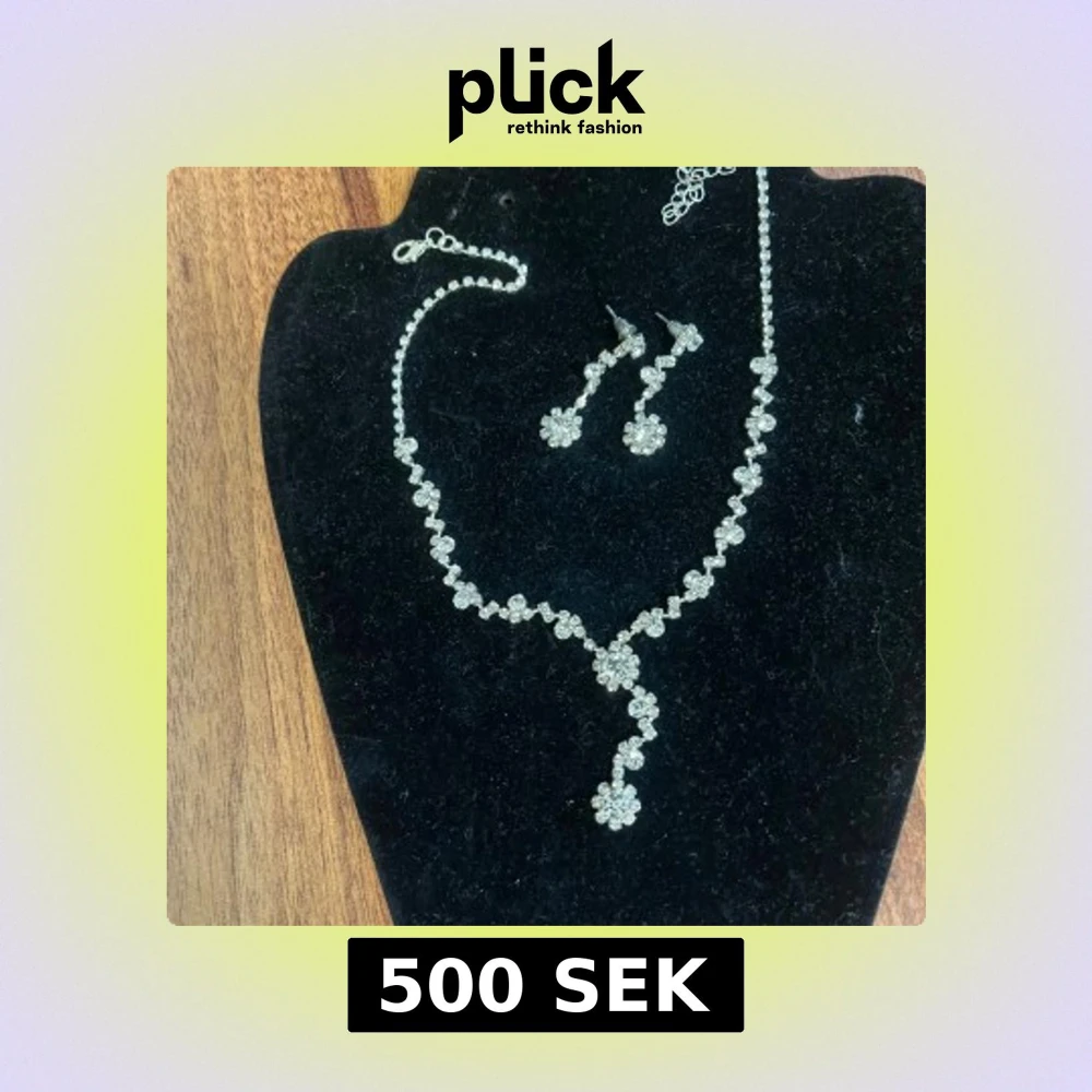 Säljer ett glittrigt silverset med halsband och matchande örhängen. Halsbandet har en Y-formad design med små blommor av gnistrande stenar och örhängena har samma blommiga stil. Perfekt för dig som vill ha extra bling och elegant look.