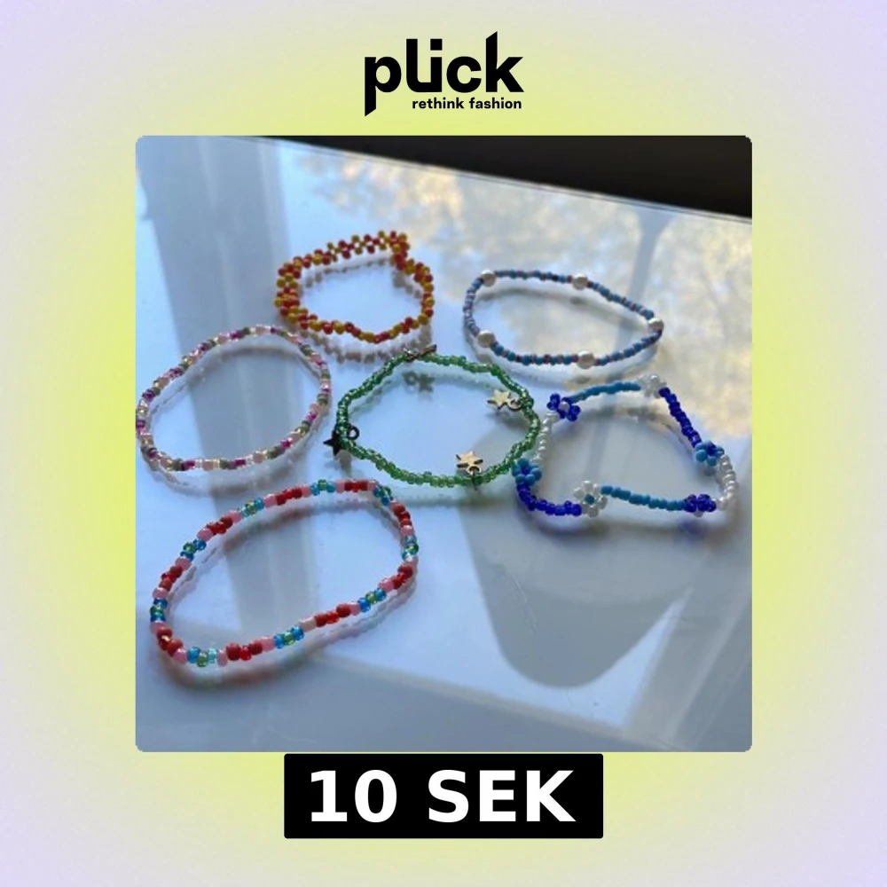 Säljer sex handgjorda pärlarmband i olika färger och mönster. Ett grönt armband med små guldstjärnor, ett med blå och vita pärlor i blommönster, ett med röda och gula pärlor, ett med blå och rosa pärlor och vita pärlor, ett med pastellfärgade pärlor och ett med röd, blå och rosa mix. 10 kronor styck!!