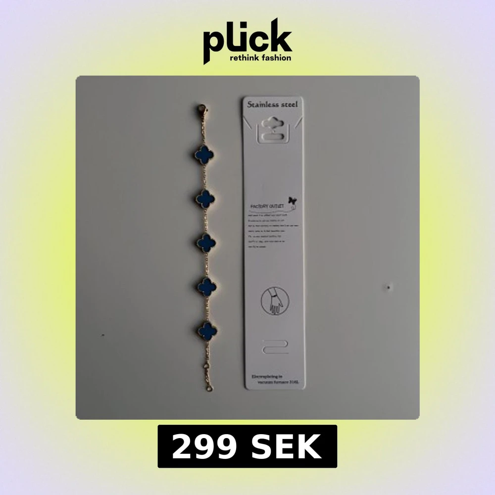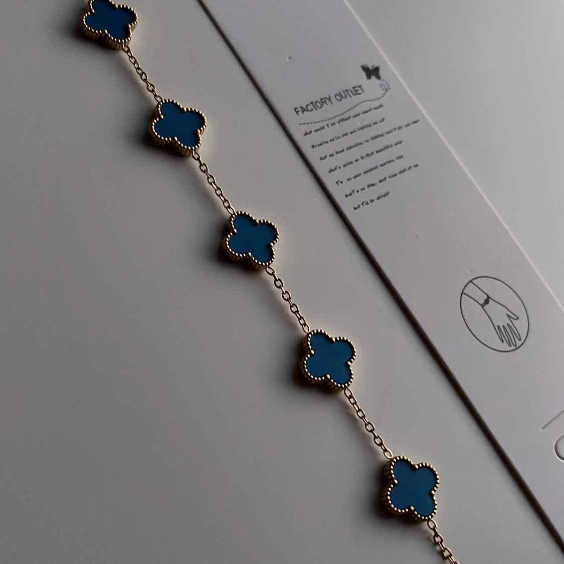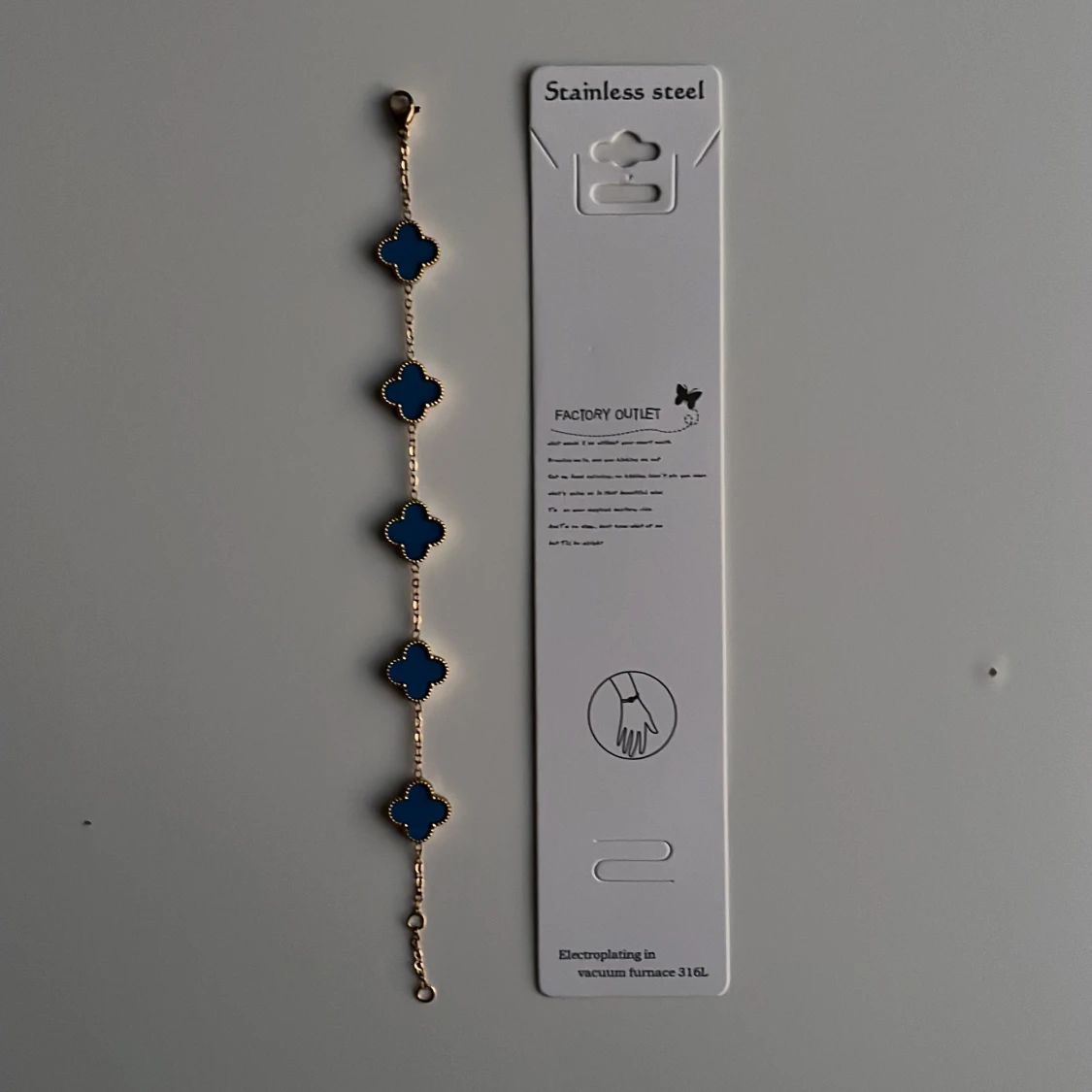 Snyggt armband med fem blå fyrklöverformade berlocker infattade i guldfärgad metall. Länken är tunn och elegant, och berlockerna har en pärlad kant som ger extra detalj. Perfekt för dig som gillar färg och unika former. Mvh clover.se