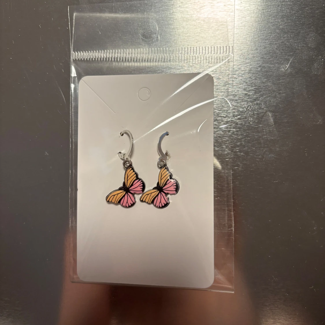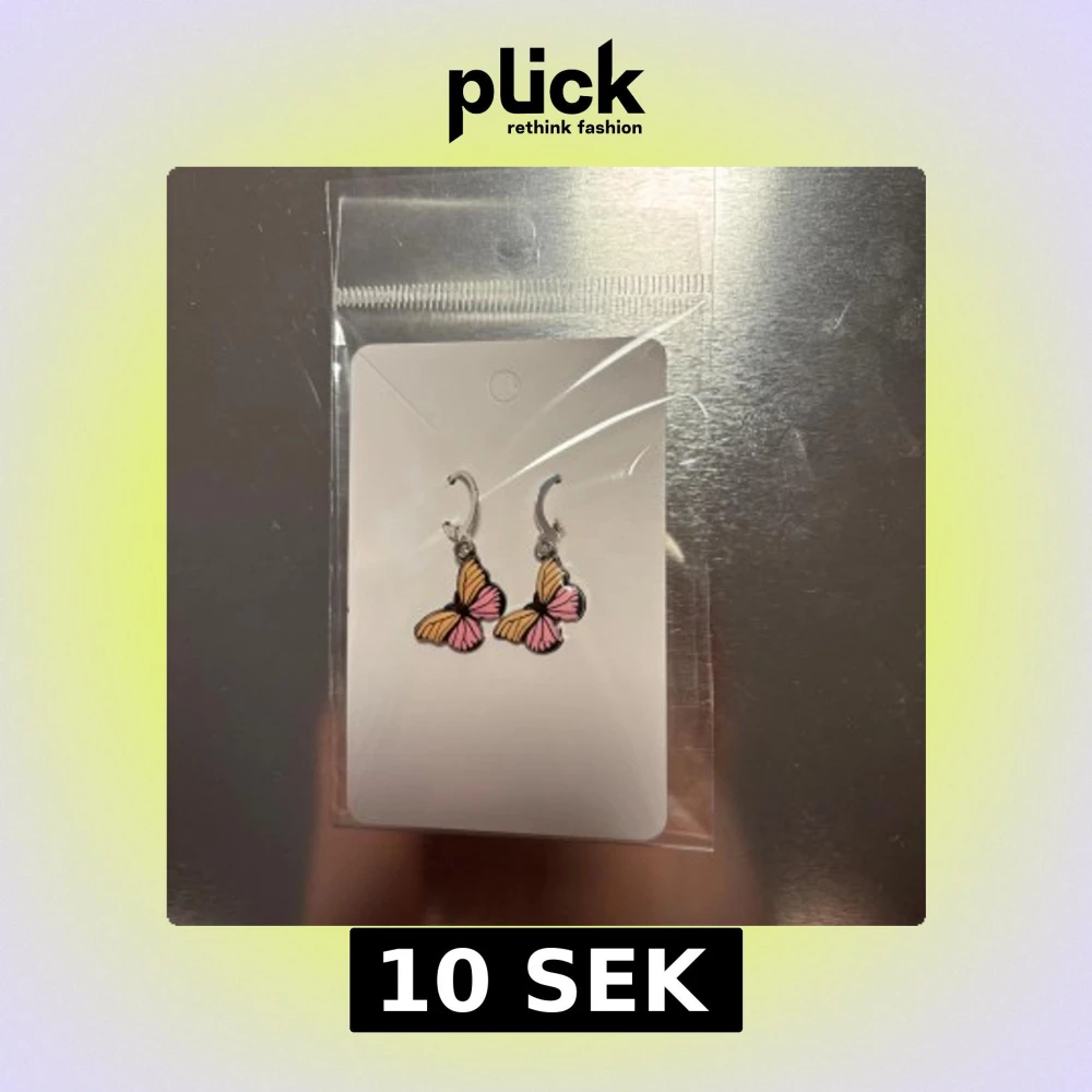 Charmiga örhängen med fjärilsdesign i rosa och orange. Perfekta för att lägga till en färgglad touch till din outfit. De hänger från en silverfärgad krok och är lätta att bära. (Billigt material)
