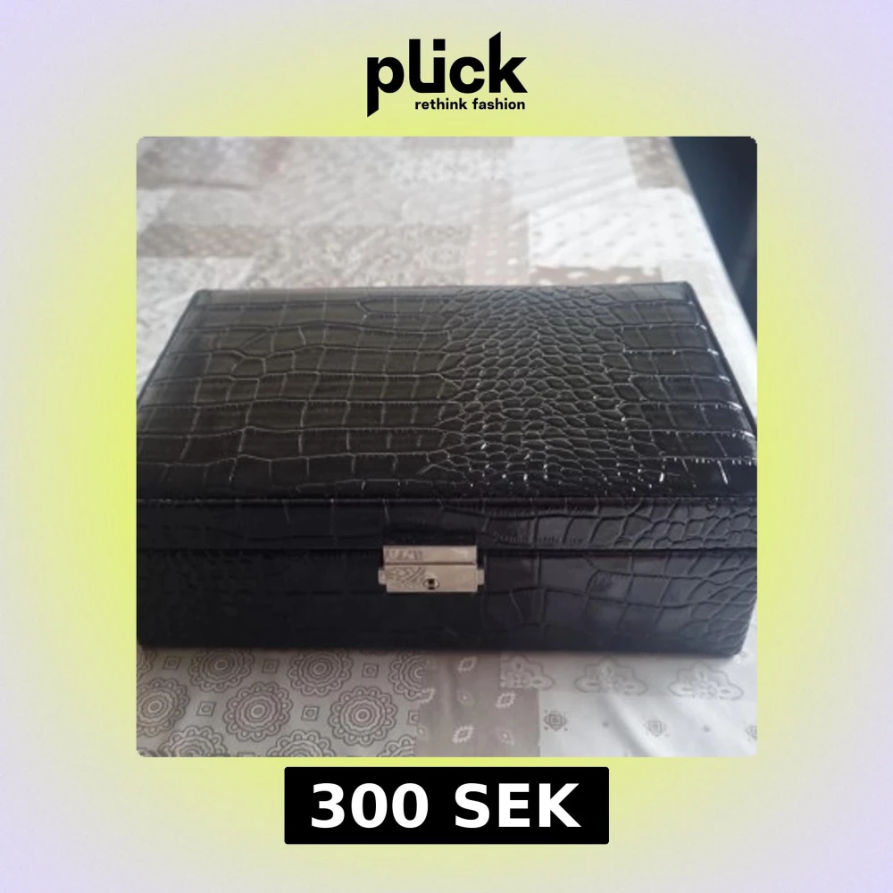 Stilren svart smyckesbox i krokopräglat skinn med silverfärgat lås och nyckel. Insidan har flera fack och ringrullar i beige sammet samt en stor spegel i locket. Perfekt för att organisera smycken och accessoarer på ett snyggt sätt.