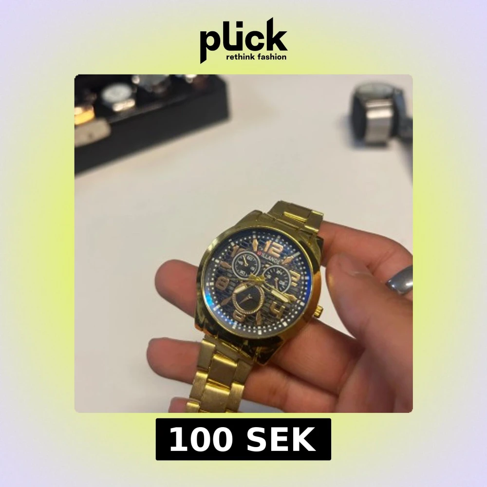 Snygg guldig klocka från Willande med länkarmband i metall och detaljerad urtavla med flera små ur. Urtavlan är svart med guldiga siffror och visare, och armbandet har klassisk länkdesign. Perfekt accessoar för dig som gillar stilrena detaljer. OBS som ni ser i bild 3 och 4 så är det en liten pinne borta som jag har tappat annars har jag bara använt den en fotal gånger då jag köpt den i Dubai, priset är inte hugget i sten