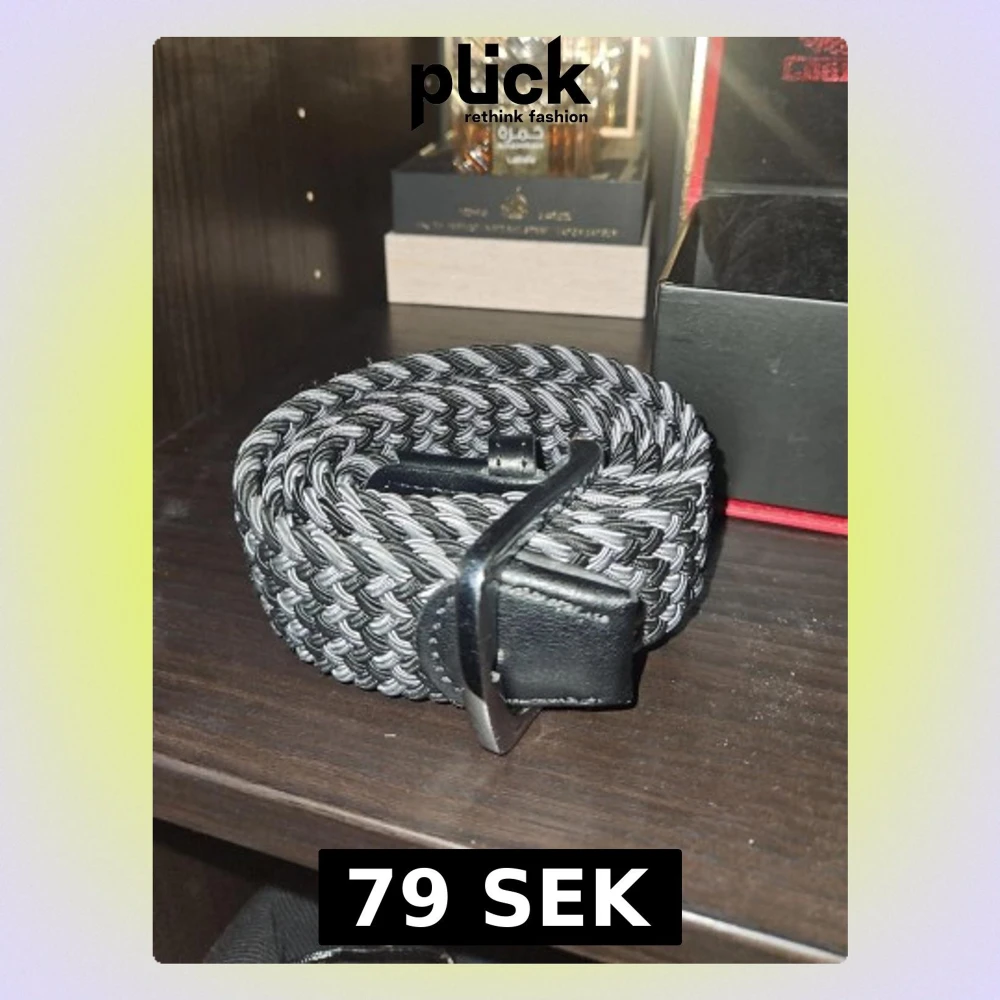Helt nytt skärp inga som hälst täcken på användning, köpt för cirka [220kr]Säljer ett snyggt flätat bälte i svart och grått med metallspänne och detaljer i svart konstläder. Perfekt accessoar för att lyfta din outfit med en modern touch. Passar till både jeans och chinos.