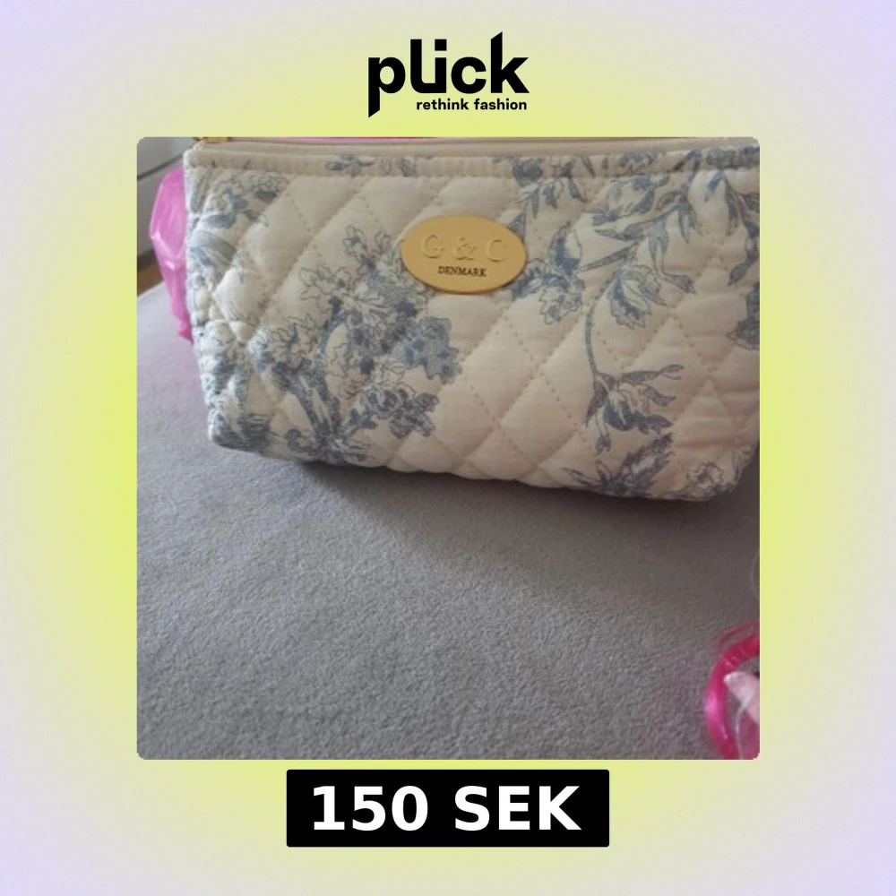 Snygg quiltad väska med blommigt mönster i blått och vitt från G&C Denmark. Väskan har en dragkedja upptill och en elegant guldplatta med logotyp. Perfekt för att hålla dina småsaker organiserade.