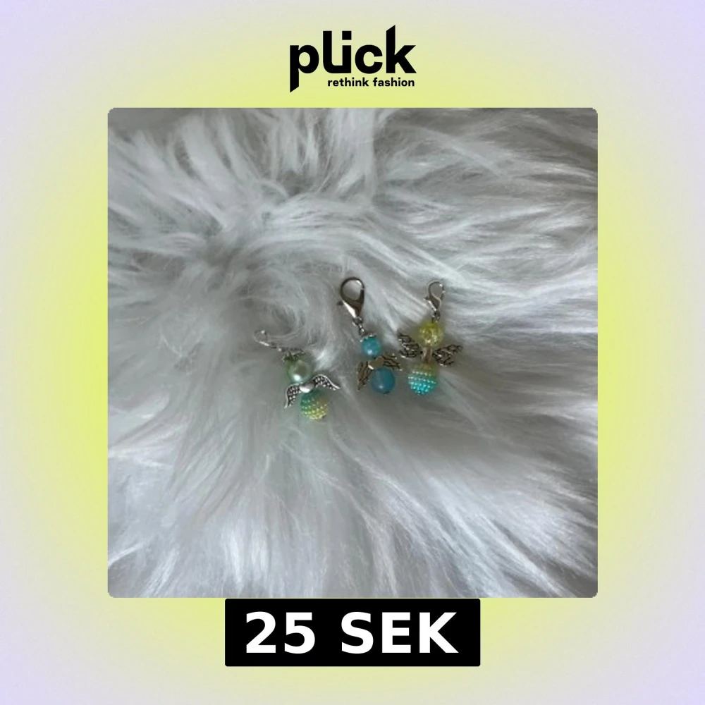 Tre söta berlocker formade som änglar med pärlor i blått, grönt och gult. De har silvriga vingar och karbinhakar, perfekta att hänga på vad som helst. Pärlorna har olika texturer och ger ett lekfullt intryck. Kan säljas i kitt och enskilt. 25 kr för en och 60 kr för alla tre. Dom är också handgjorda aldrig använda.