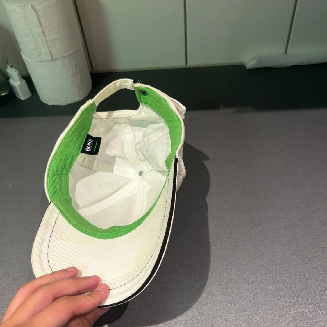 Snygg vit keps från BOSS Hugo Boss med svart broderad logga framtill. Klassisk böjd skärm med svart söm och justerbar rem baktill. Insidan har en fräsch grön detalj längs svettbandet. Perfekt accessoar för en clean och sportig look.