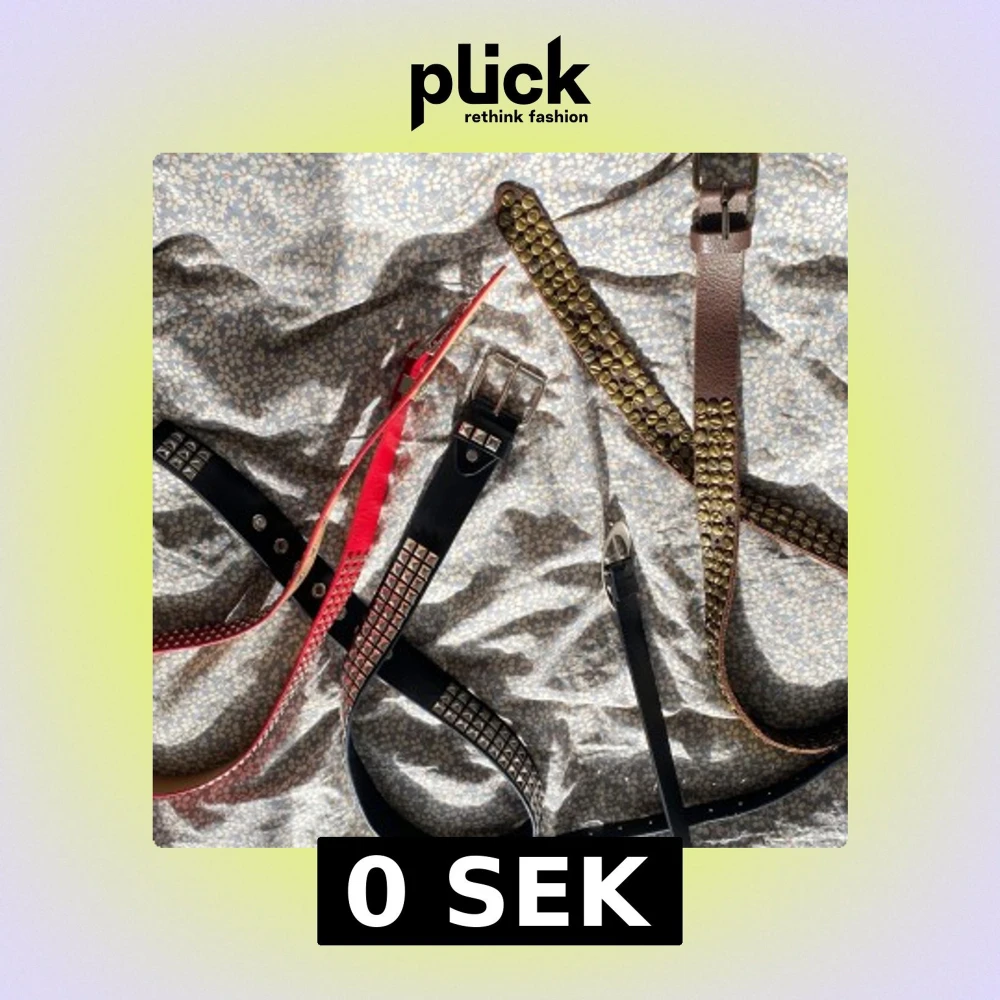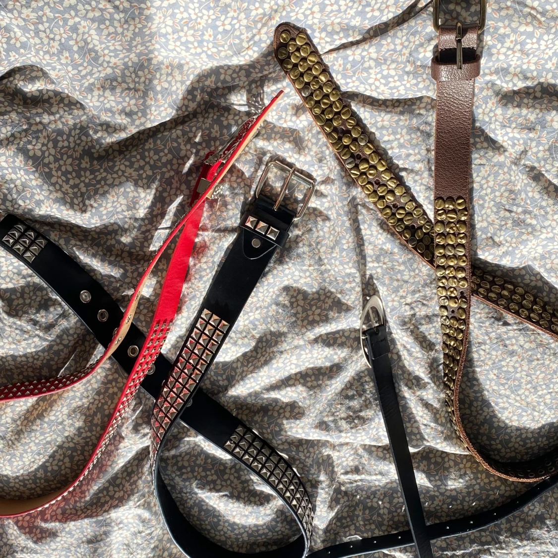 Fyra bälten med coola nitar och detaljer: ett svart bälte med silverfärgade fyrkantiga nitar (99cm), ett rött bälte med små runda nitar (107cm), ett brunt bälte (108cm) med stora guldfärgade nitar och ett smalt svart bälte (99cm) med silverdetalj vid spetsen. Perfekt för att ge outfiten en edgy vibe. Kom med prisförslag