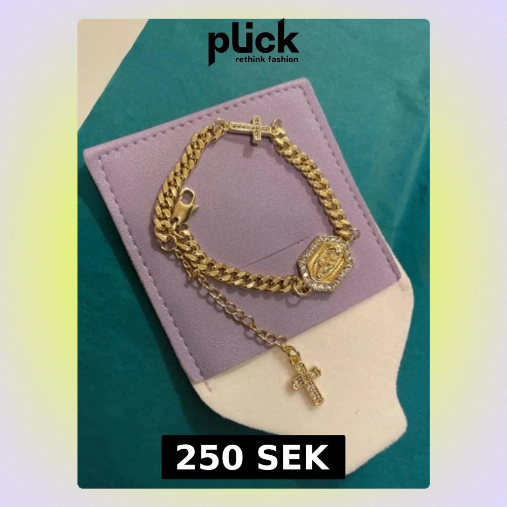 Bilderna visar ett guldfärgat armband med kors och medaljong, ingen väst finns med.