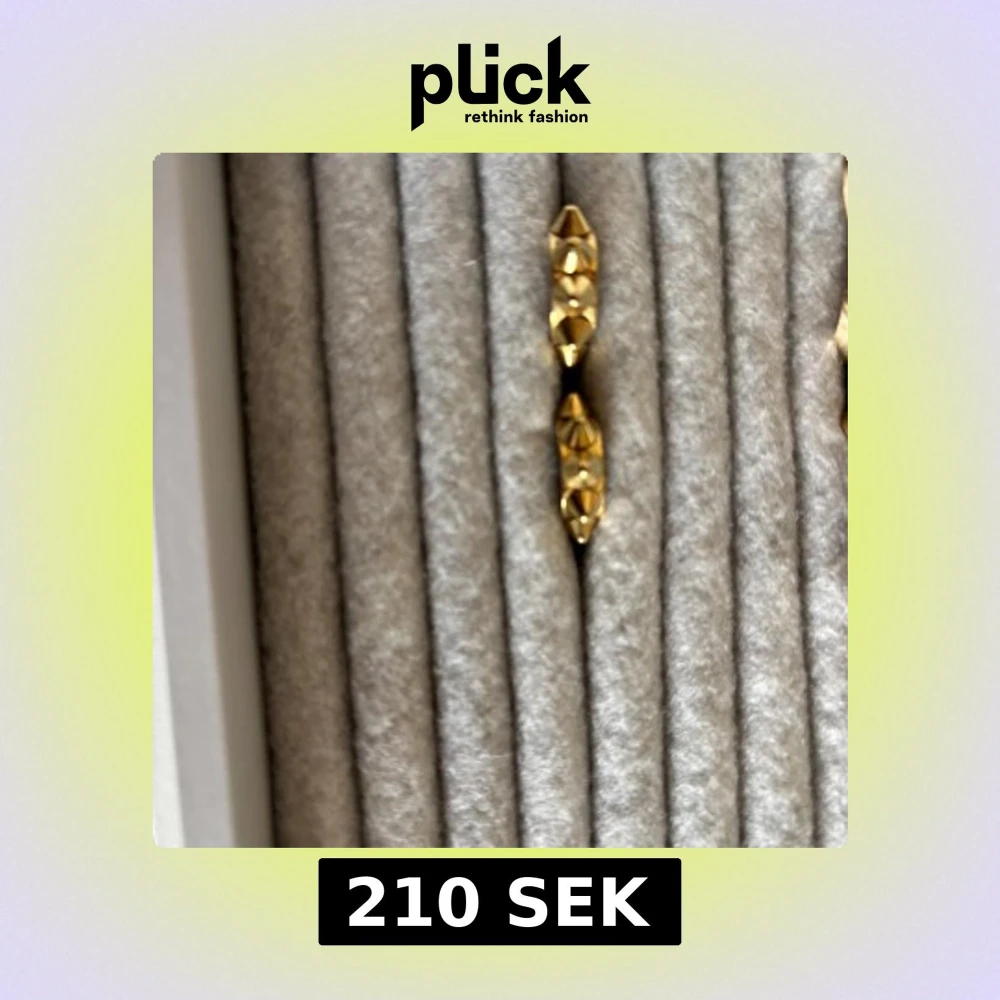 Säljer ett par coola örhängen från Bonvad i guldtonad metall. De har en rund form och är dekorerade med spetsiga nitar som ger en edgy vibe. Perfekt för dig som vill sticka ut med din stil och gillar detaljer som syns. Ny pris 400kr
