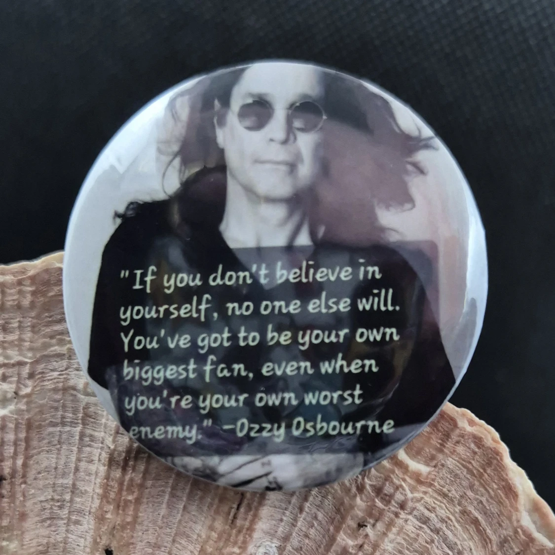 Den här pinsen med bild på Ozzy är ca 4.3 × 4.3 cm. Speglingar på pinsen kan synas på bilderna.