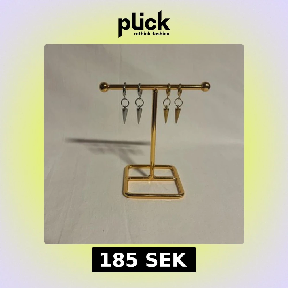 Två par örhängen med coola spetsiga hängen, ett par i silverfärg och ett par i guldfärg. Hängena är konformade och sitter på små ringar, vilket ger en edgy vibe. Perfekt för dig som gillar minimalistisk men ändå statement smycken.