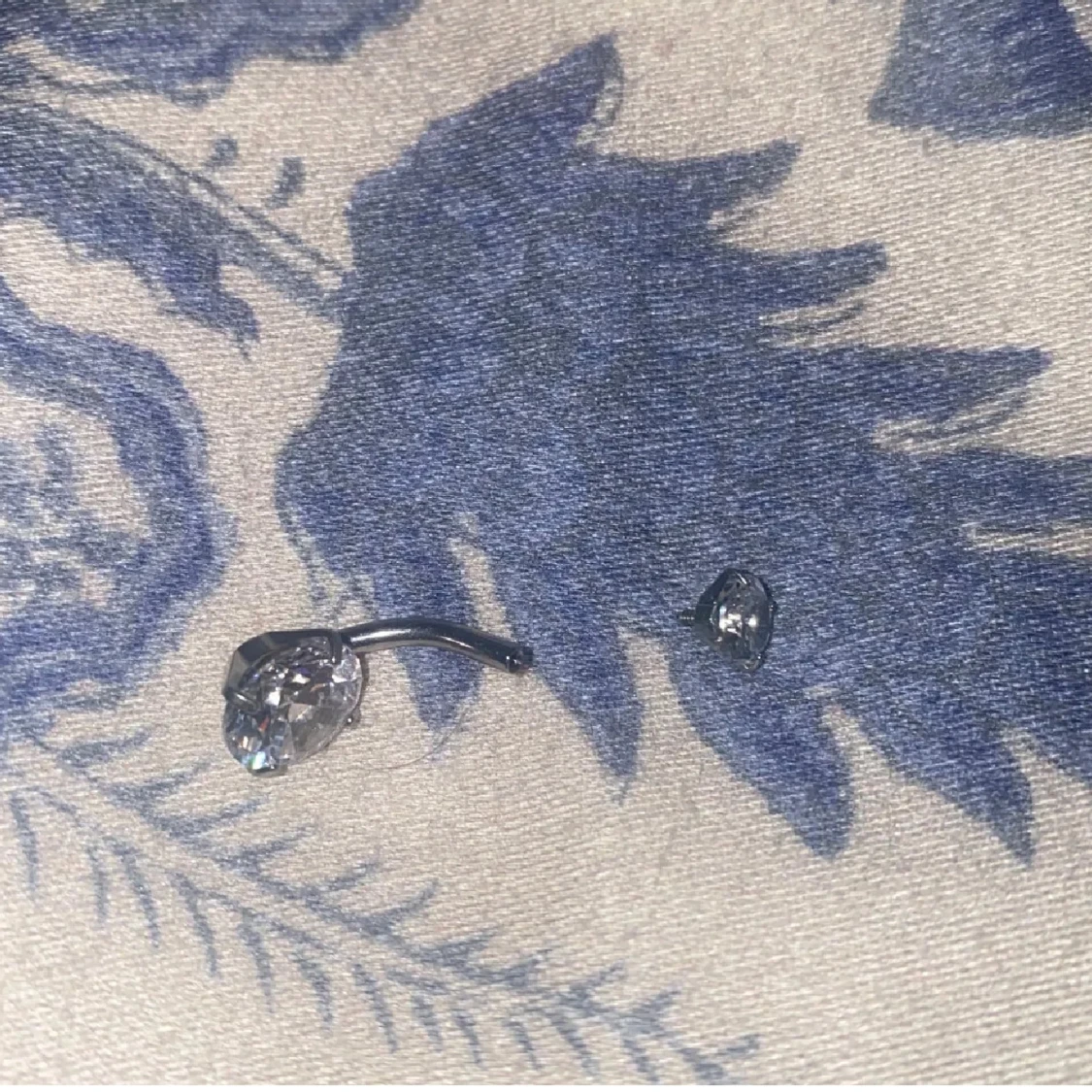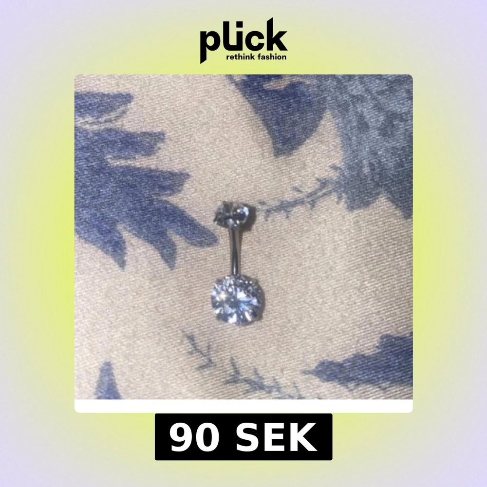 Säljer en snygg navelpiercing i silverfärgad metall med två stora, glittriga, runda stenar som verkligen fångar ljuset. Perfekt för dig som vill ha något som syns och ger extra bling till din look.
