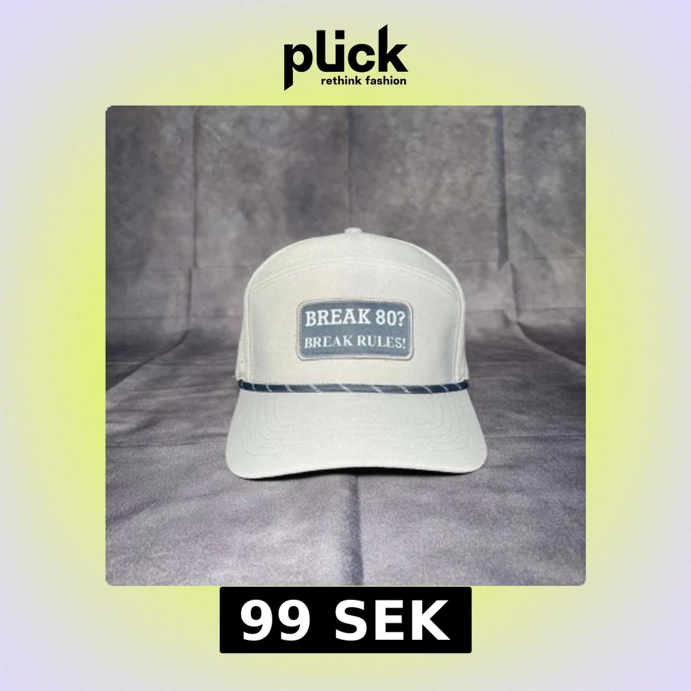 Snygg beige keps med broderad patch framtill där det står 'BREAK 80? BREAK RULES!'. Kepsen har böjd skärm och en dekorativ snodd ovanför skärmen.