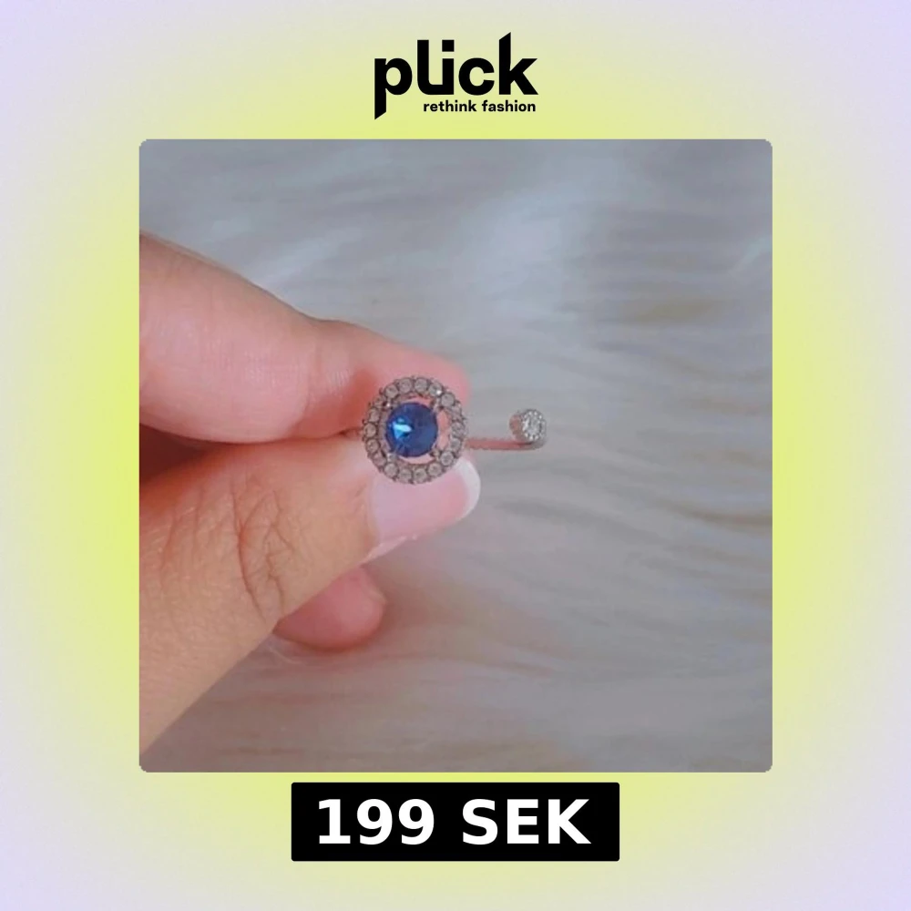 Silverfärgad Lily and Rose ring med en stor rund blå sten i mitten, omgiven av små klara kristaller. Ringen är öppen