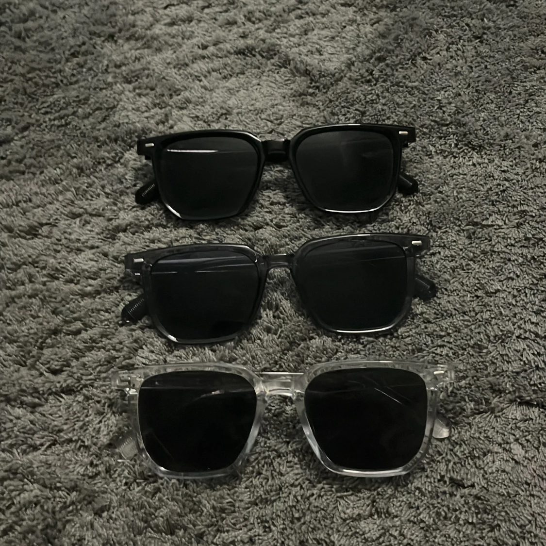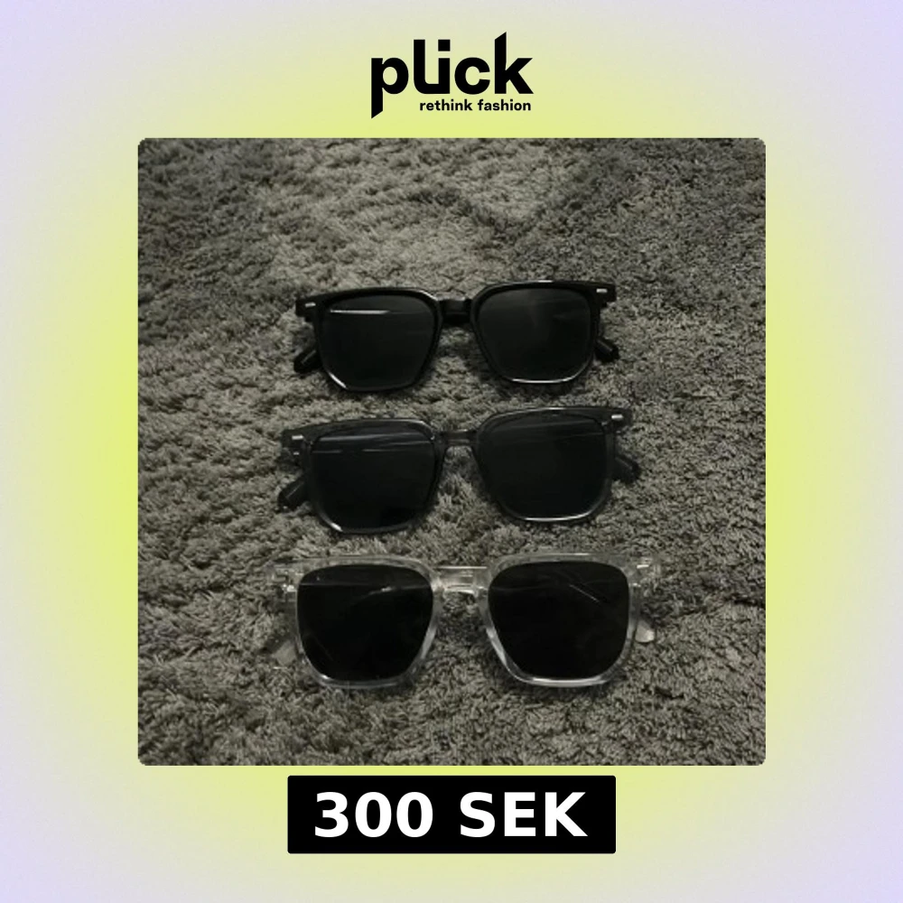 Säljer tre par stilrena solglasögon med fyrkantig form. Ett par svarta ett mörkgrått och ett genomskinligt par. Alla har mörka linser och passar perfekt för en trendig look. Dessa glasögon är sjukt stiliga och riktigt bekväma.