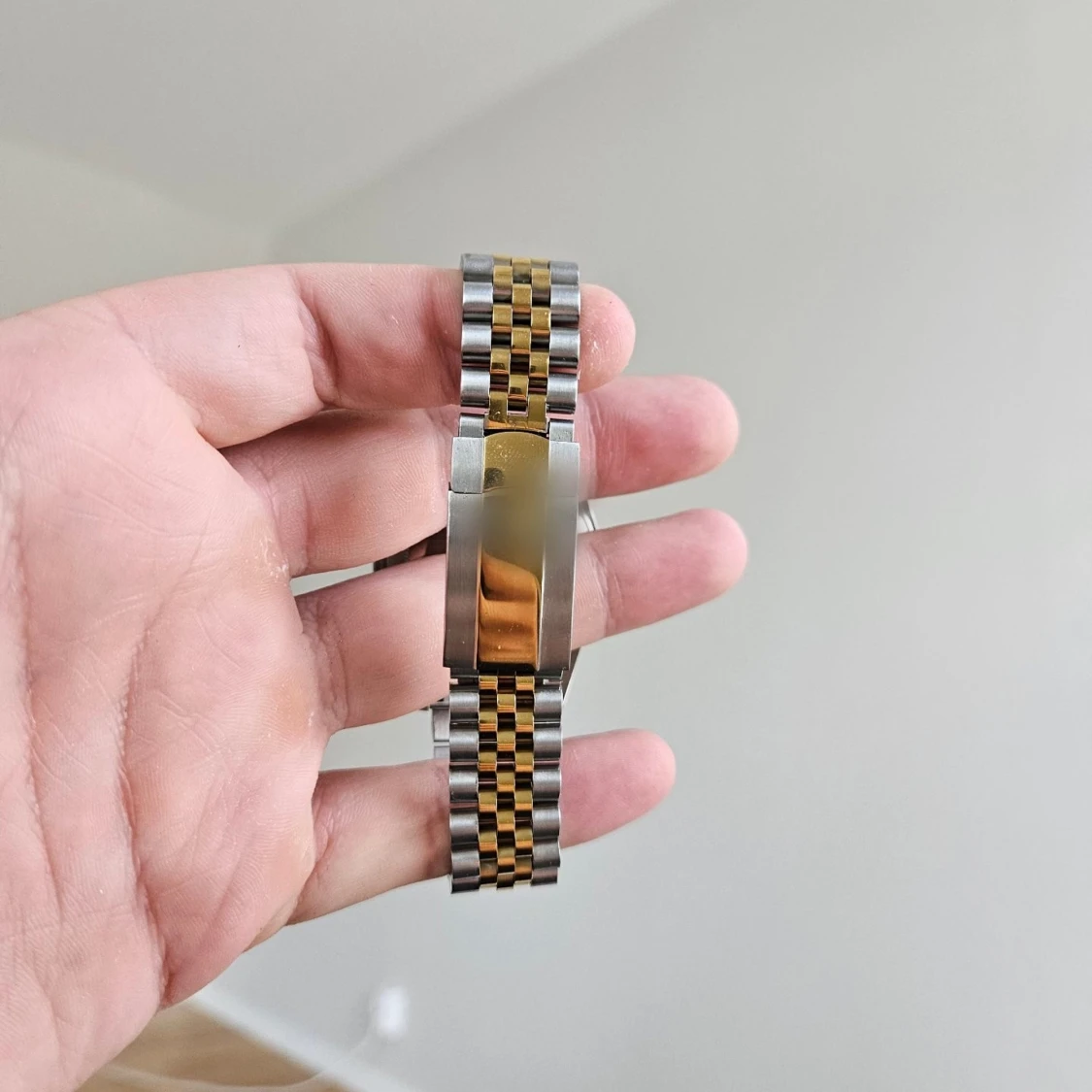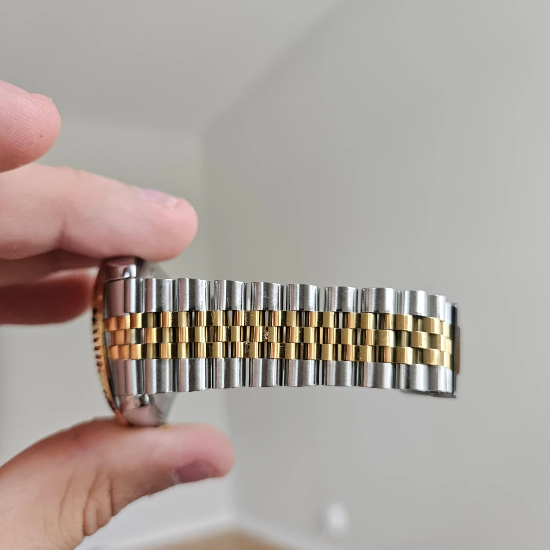 Tvåtonad klocka med gulddetaljer