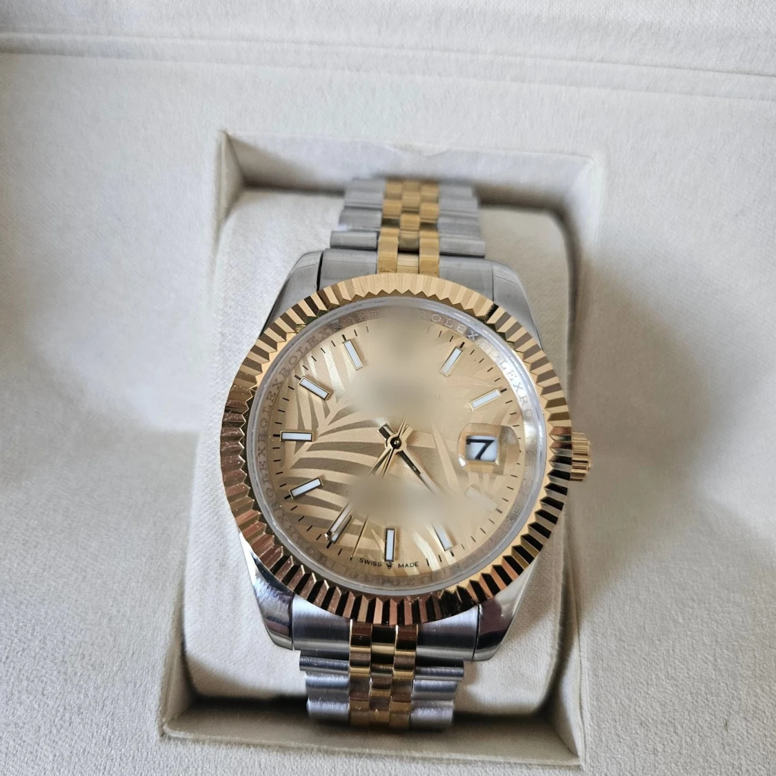 Stilren klocka med tvåfärgad länk i silver och guld. Urtavlan är guldig med markerade index och datumfönster. Boetten har en räfflad guldfärgad kant som ger en lyxig känsla. Perfekt accessoar för dig som gillar klassisk och tidlös design.