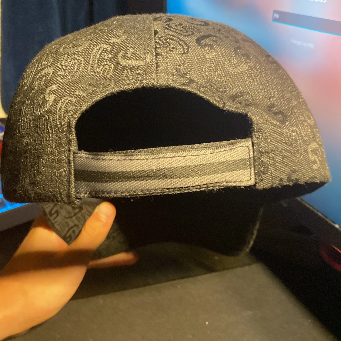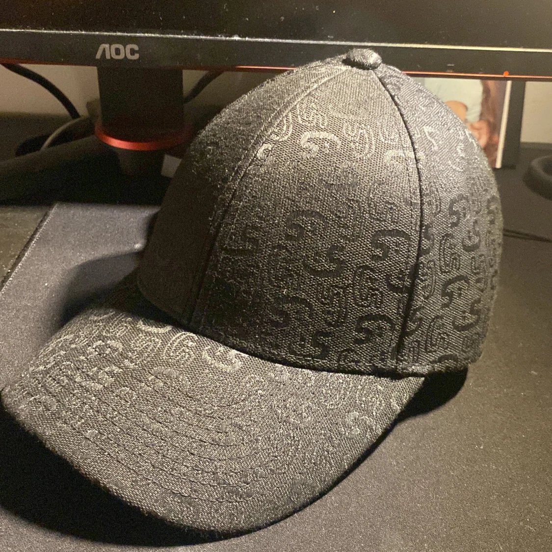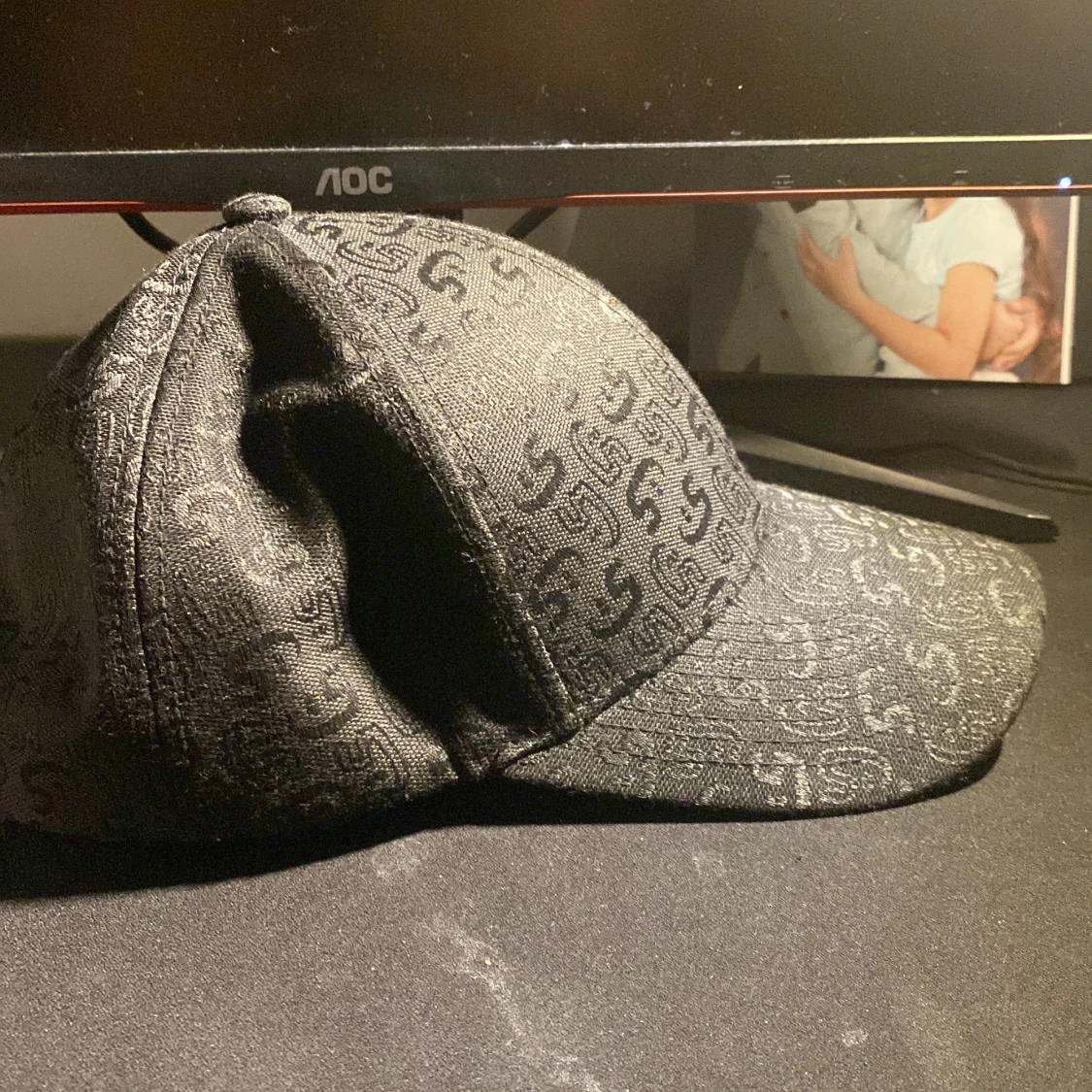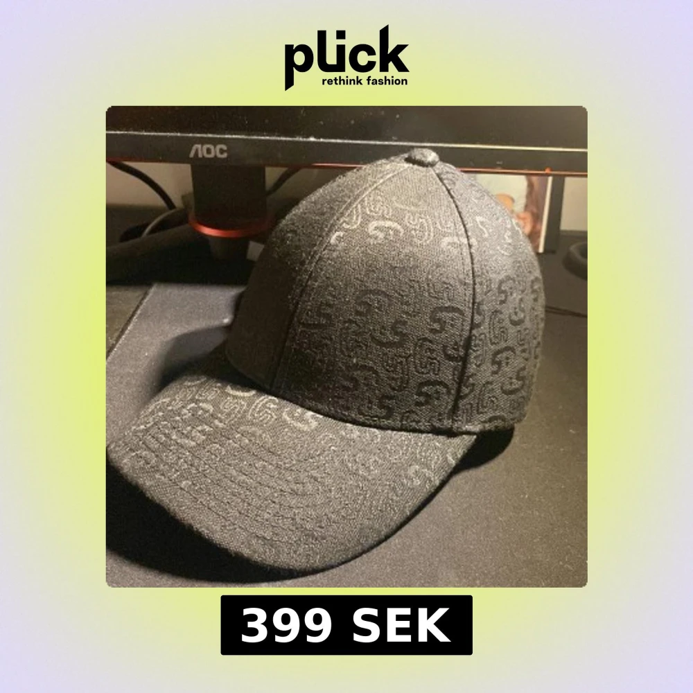 Snygg svart keps med ton-i-ton mönster av bokstäver och symboler över hela ytan. Klassisk böjd skärm och justerbar rem baktill för perfekt passform. Materialet känns som bomull och polyester, vilket gör den både bekväm och stilren.