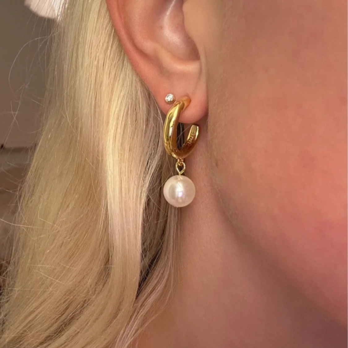 Säljer ett par chunky guldiga hoops med hängande rund vit pärla. Örhängena har en stilren och modern design som ger en lyxig vibe. Perfekta för dig som vill ha något som sticker ut men ändå är klassiskt. Passar till alla tillfällen och är superenkla att matcha.