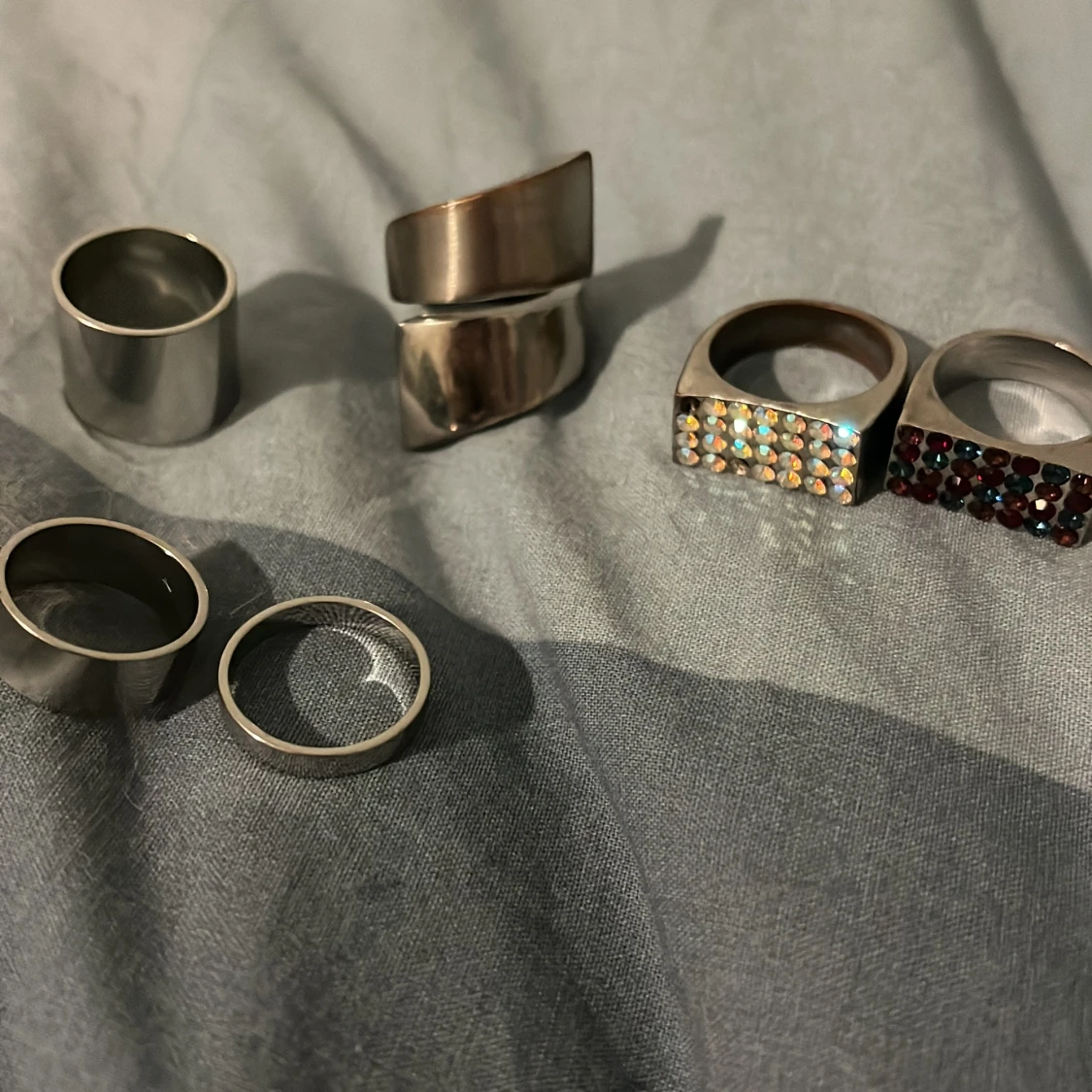 Ett set av stilrena ringar i silverfärg. Två av ringarna har en modern, bred design medan de andra två har fyrkantiga former med glittrande stenar i olika färger. Perfekt för att ge en extra touch till din outfit. ( en av dem för ungefär 2-7 kr) Pris kan diskuteras!!