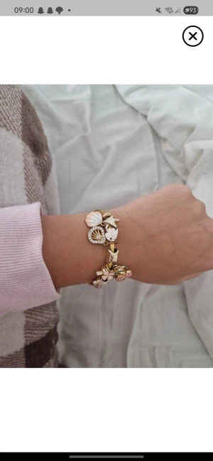 Charmigt armband i guldton med flera detaljer som snäckor, stjärna, pärlor och små glittriga stenar. Armbandet har en lekfull och strandinspirerad design med inslag av vitt och rosa. Perfekt accessoar för att lyfta din outfit med en touch av havskänsla. Köpte i spanien
