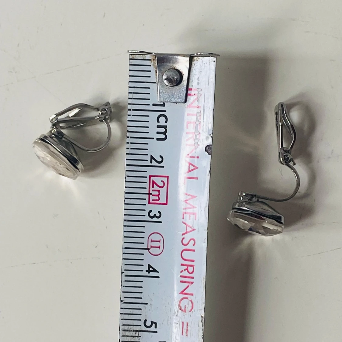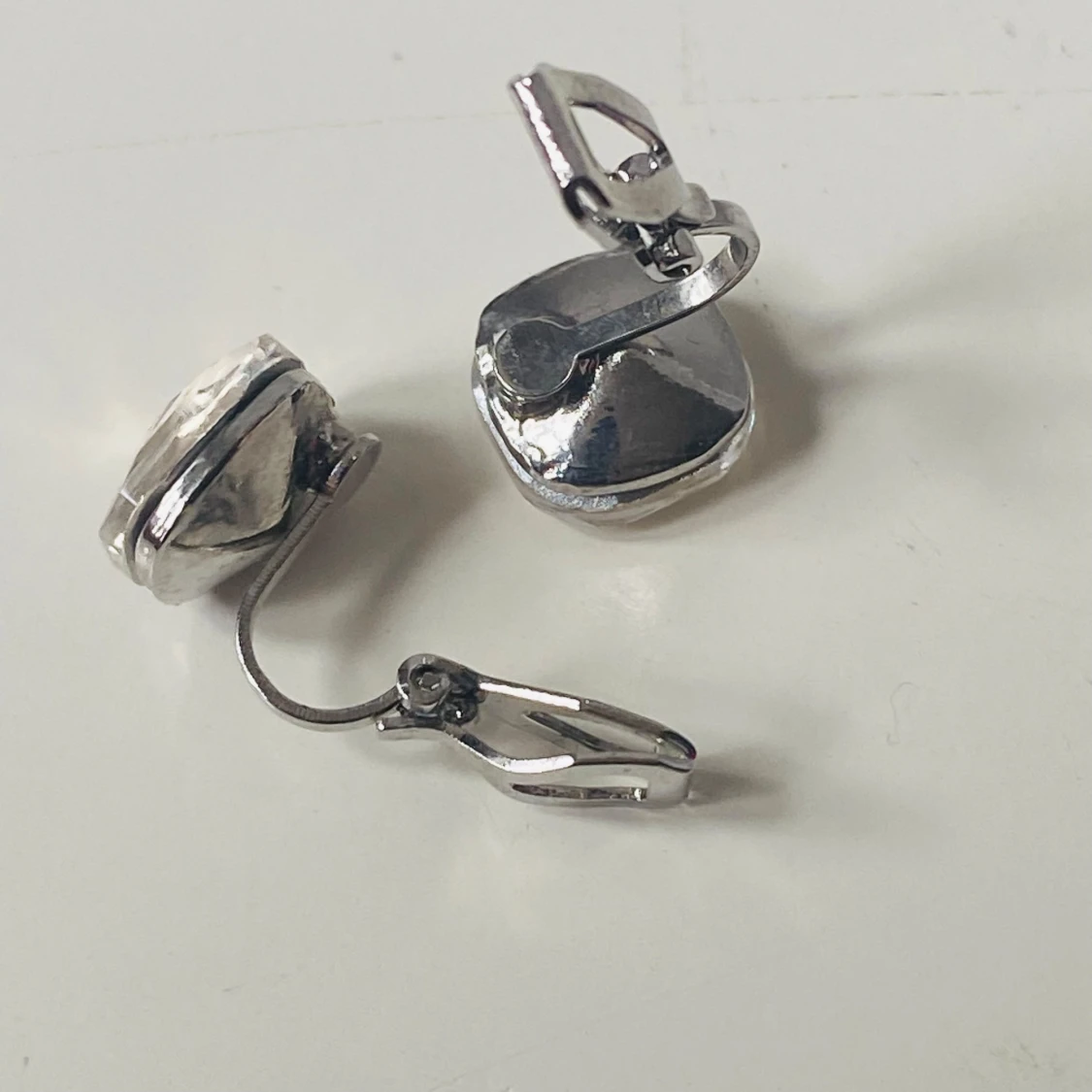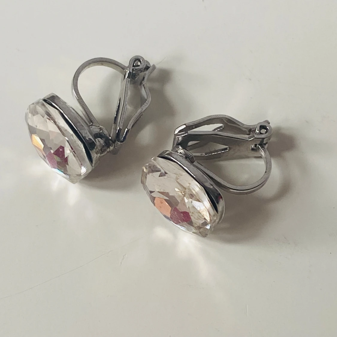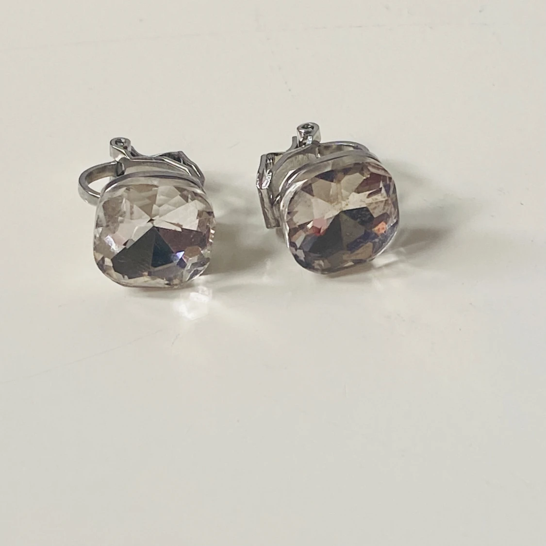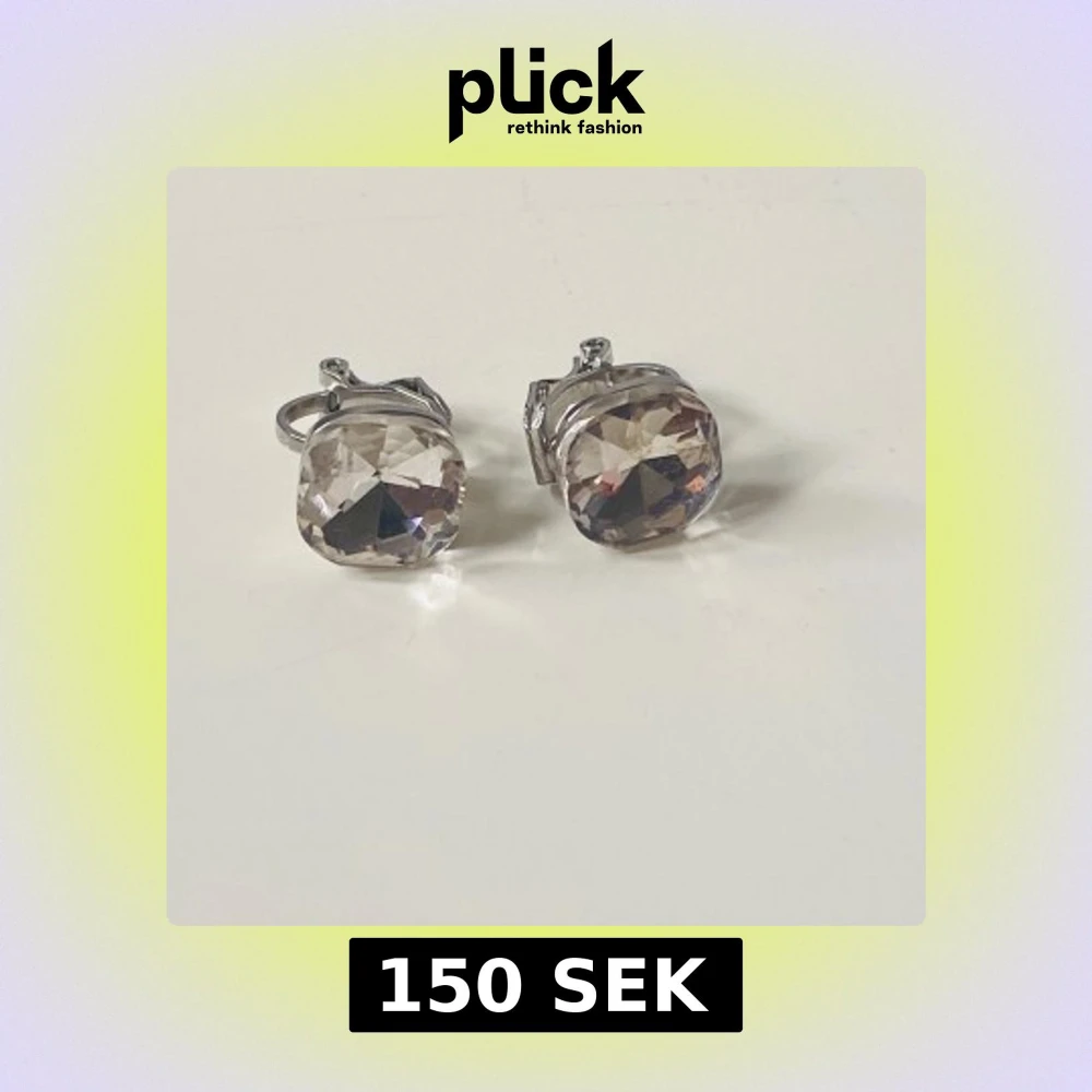 Snygga örhängen med klipsfäste i silverfärgad metall och stora, facetterade glittriga stenar som reflekterar ljuset. Stenarna är fyrkantiga och transparenta med en hint av champagne. Perfekta för att ge din look extra bling och wow-effekt.