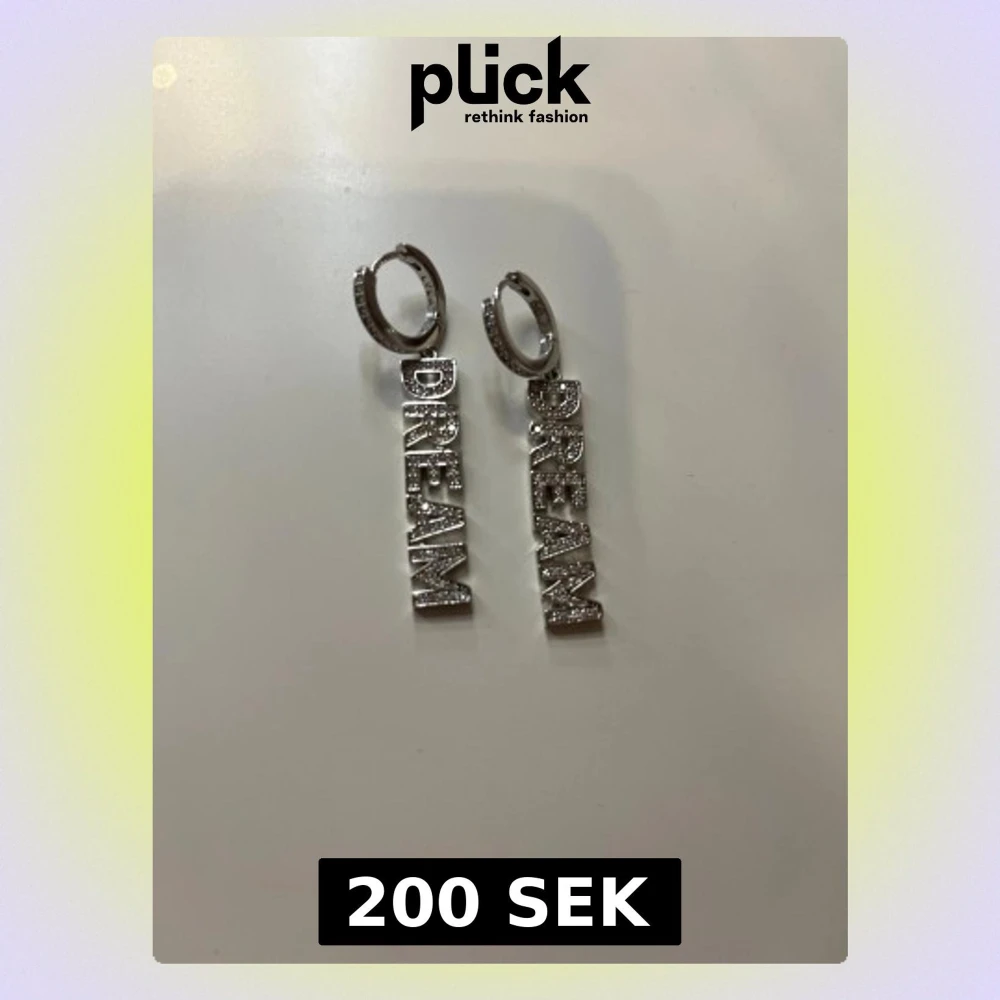 Säljer ett par snygga örhängen från LYLA i silverfärg med texten DREAM i stora bokstäver. Hela örhänget är täckt av glittriga stenar som ger en lyxig vibe. Hängande modell med rundad ring upptill och rektangulär textdel. Perfekt för att sticka ut och det är aldrig använda!🤍