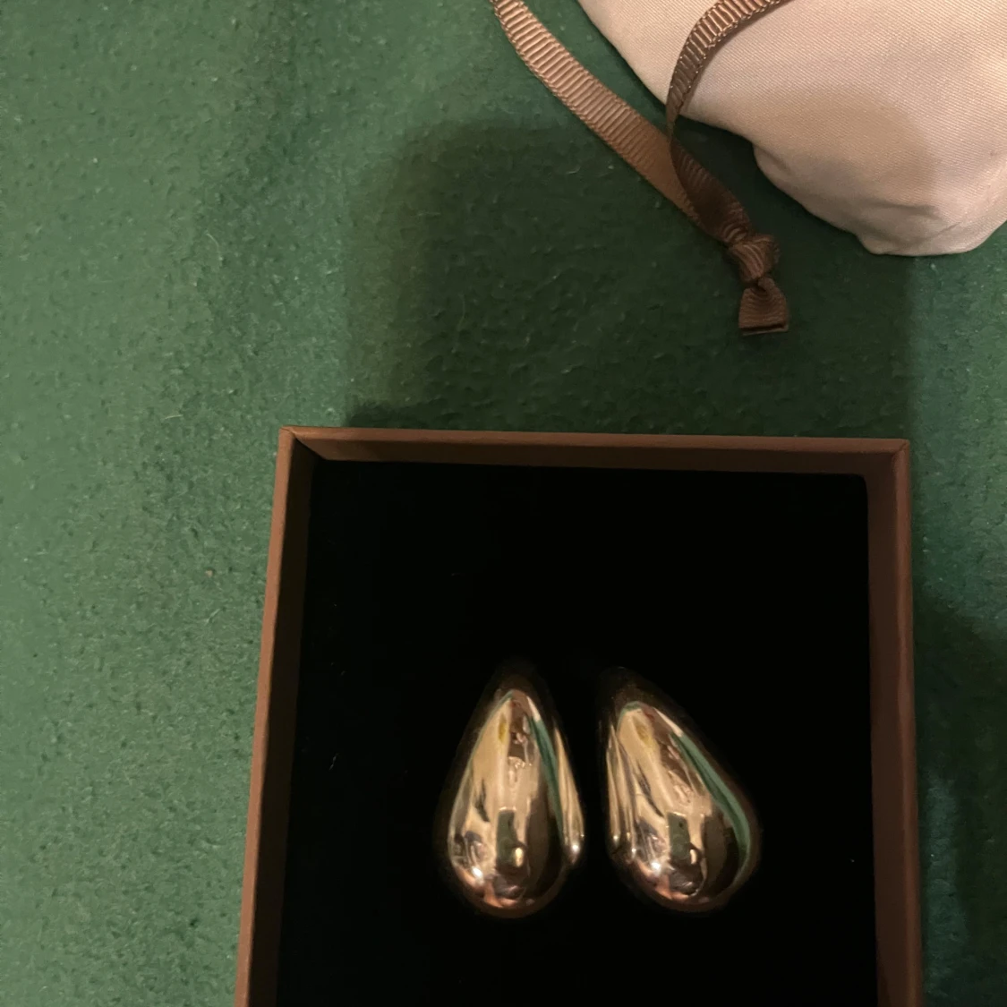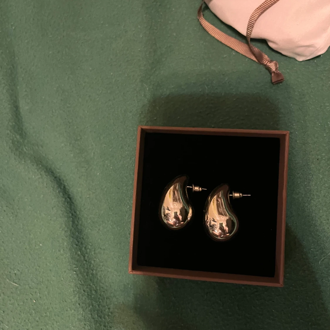 Säljer dessa trendiga örhängen i droppformad design med spegelblank silverfinish. De är stilrena och har en modern, cool vibe som verkligen sticker ut. Perfekta för dig som gillar statement-smycken och vill addera lite edge till din look. Dock ej äkta silver men bör va nickelfria. Ej använda.