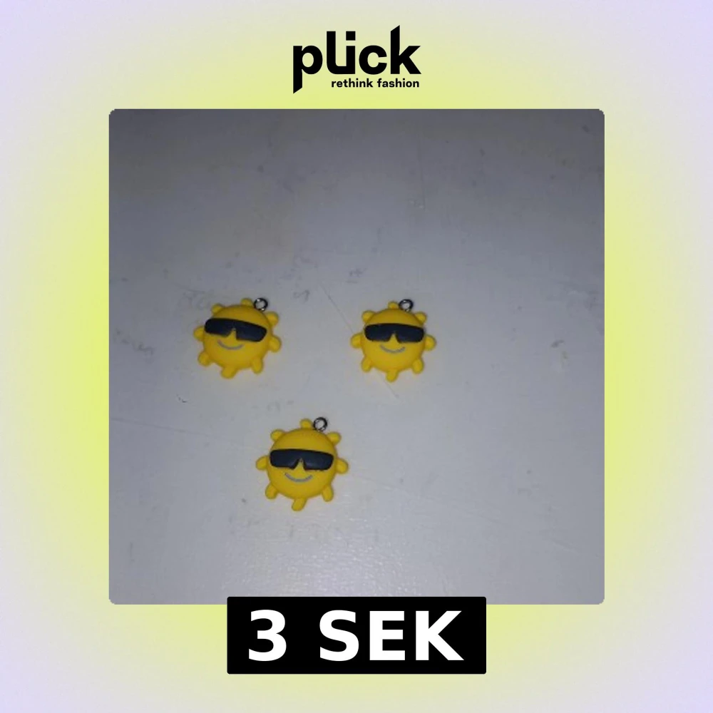 Tre söta berlocker i form av glada solar med svarta solglasögon. Perfekta att använda som hängsmycke till halsband eller armband. De är klargula och har en liten ögla för att enkelt kunna fästas på kedja eller snöre.