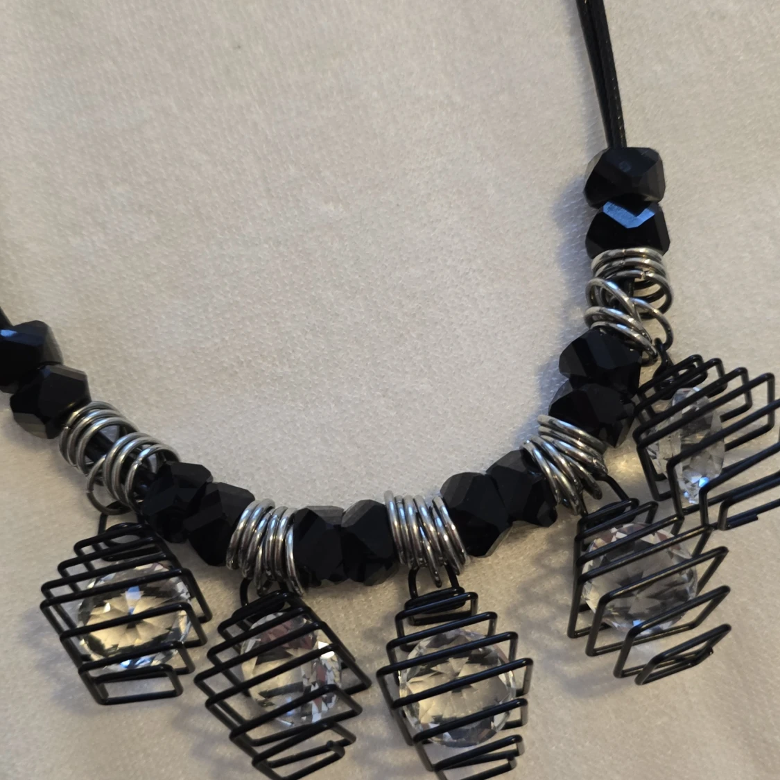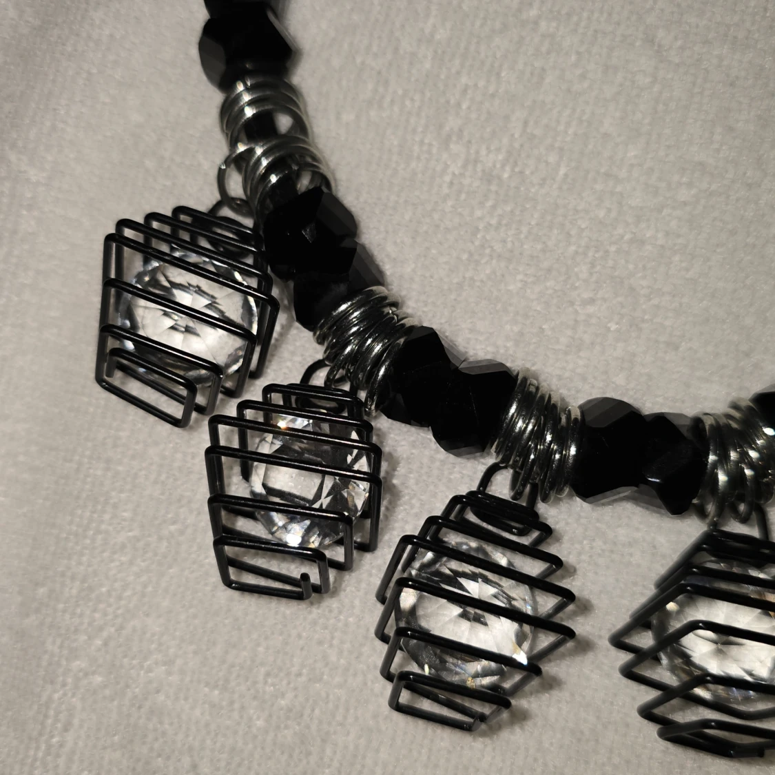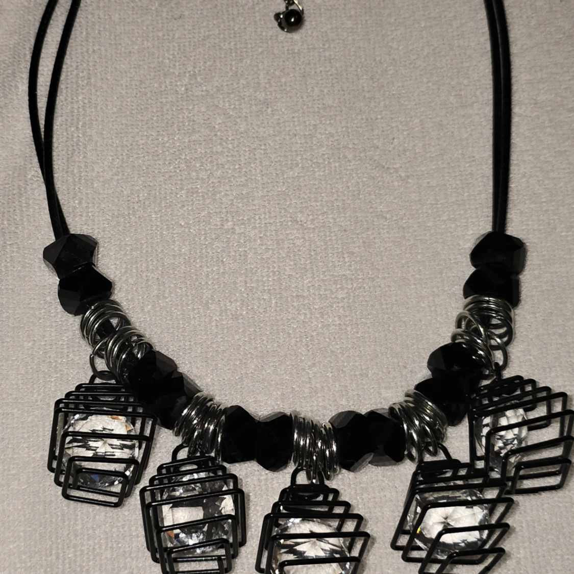Unikt halsband med svarta och silverfärgade detaljer. Halsbandet har fem burformade hängen med klara stenar inuti, vilket ger en modern och edgy look. Perfekt för att ge en extra touch till din outfit.