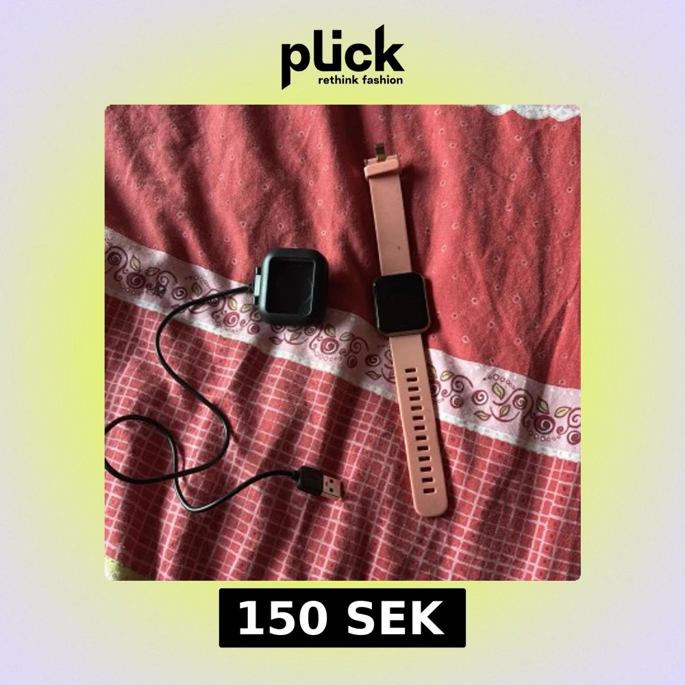 Säljer en stilren rosa smartklocka med svart skärm och matchande laddare. Klockan har en fyrkantig design och justerbart armband. Perfekt för dig som vill hålla koll på tiden och dina aktiviteter med stil.