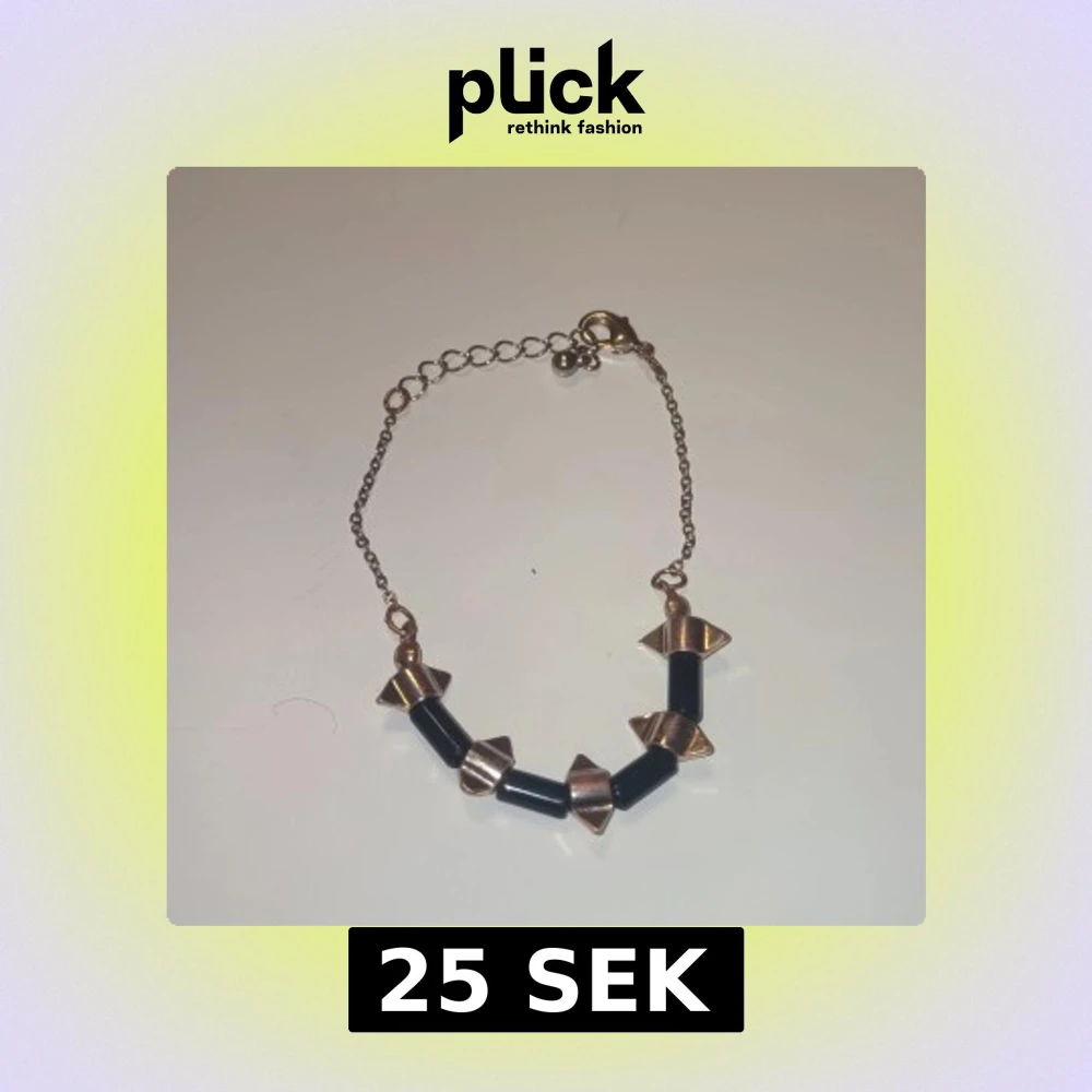Coolt armband med svarta stavar och guldiga pyramidformade nitar. Kedjan är tunn och har ett justerbart lås med en liten kula som detalj. Perfekt för dig som gillar edgy accessoarer med metalliska inslag.