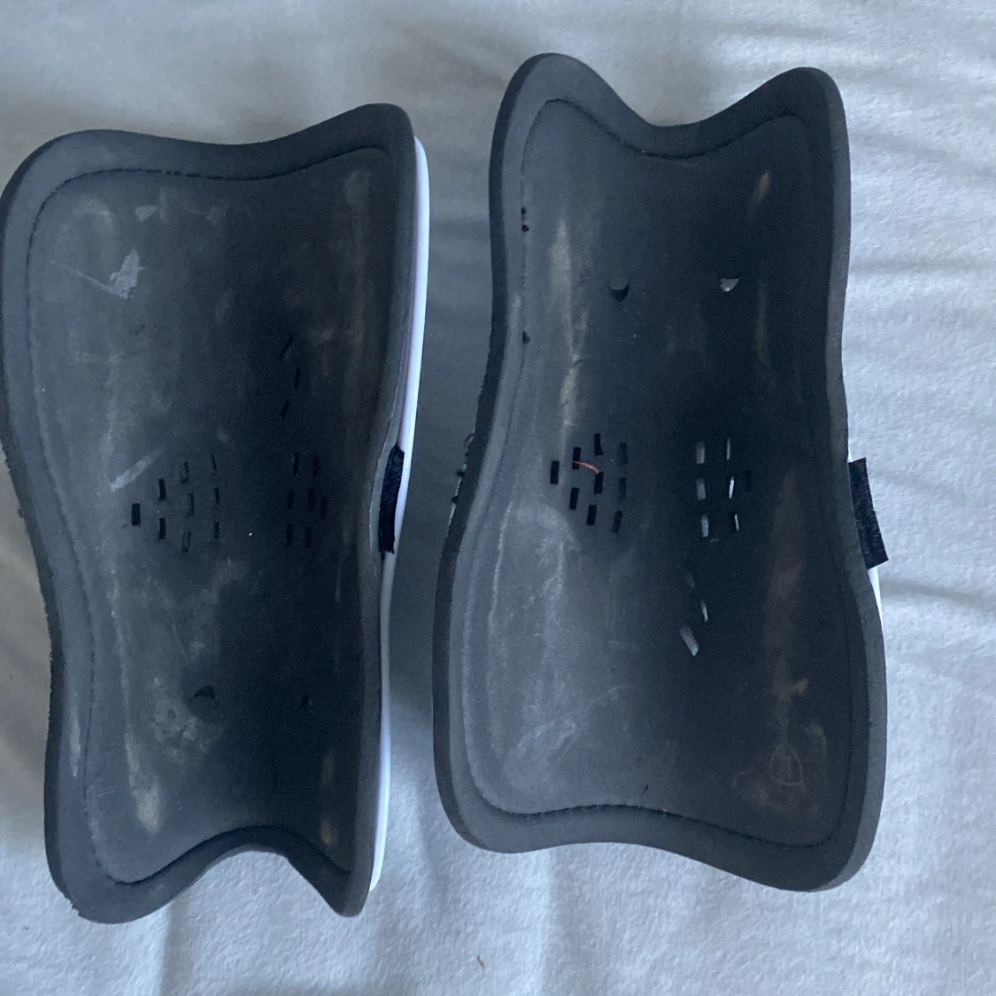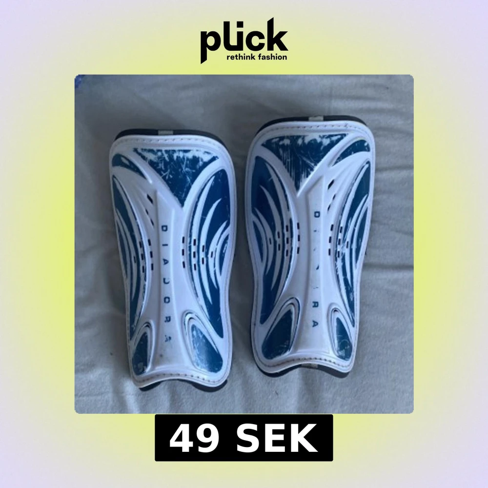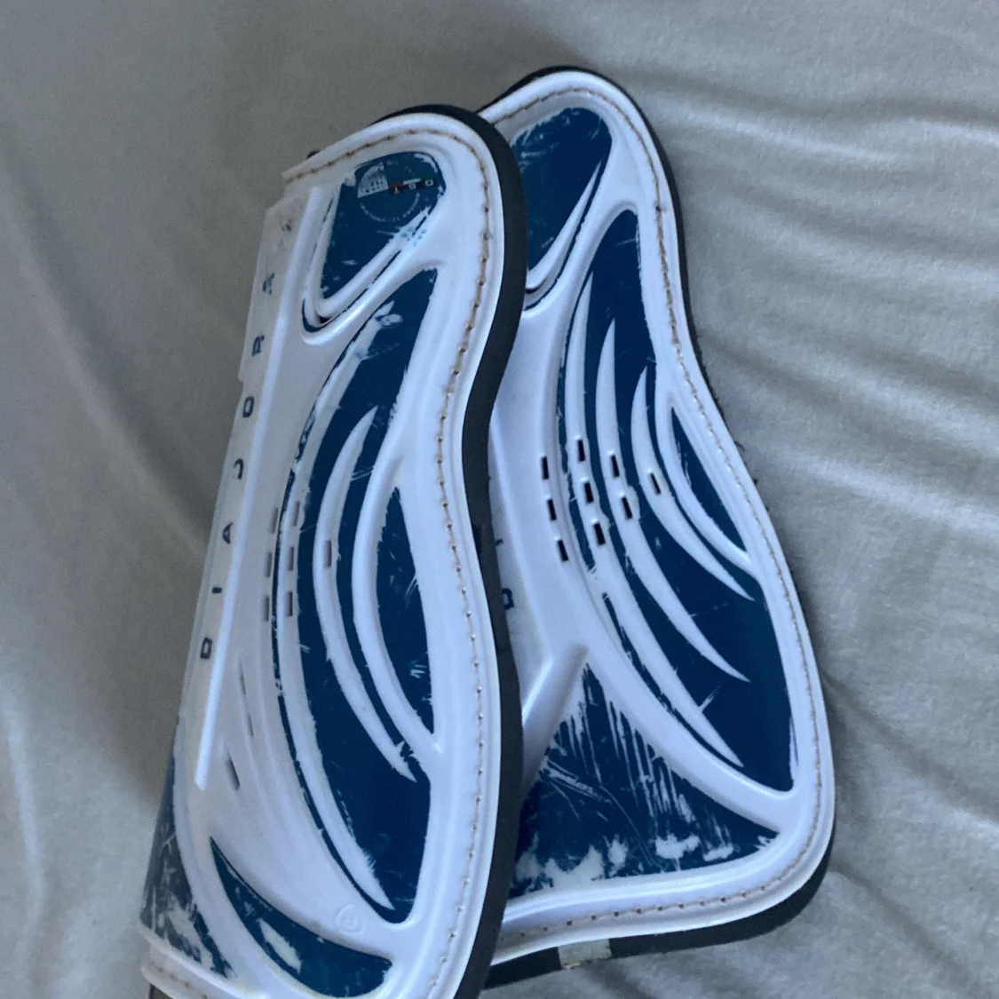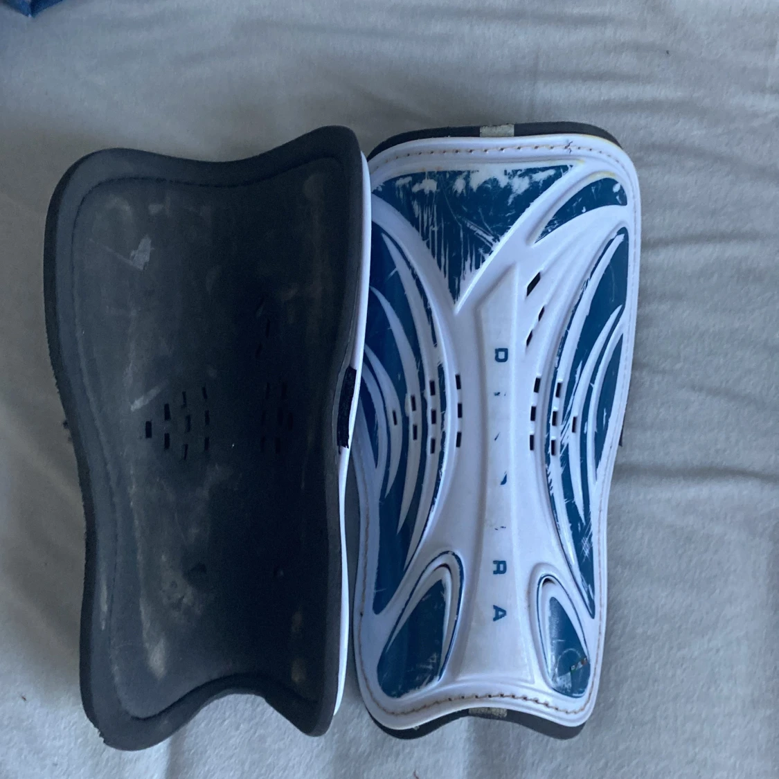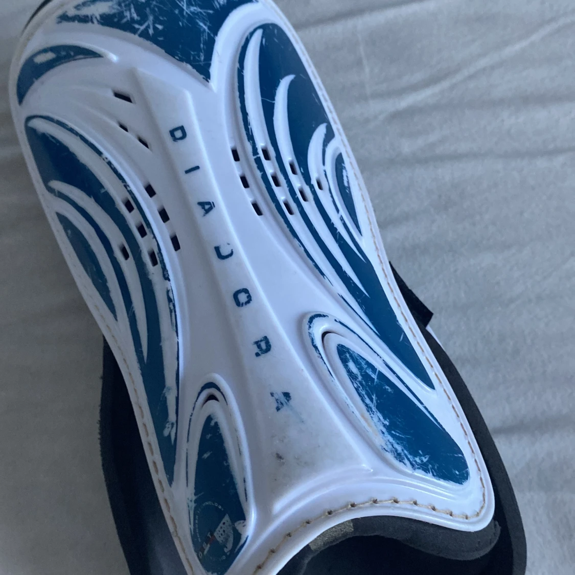 Säljer ett par benskydd från Diadora i vit och blå färg med snyggt grafiskt mönster. Ytterskalet är hårt och insidan har mjuk svart vaddering för extra komfort. Perfekta för fotbollsträning eller match. Sitter bra på benet och skyddar effektivt.