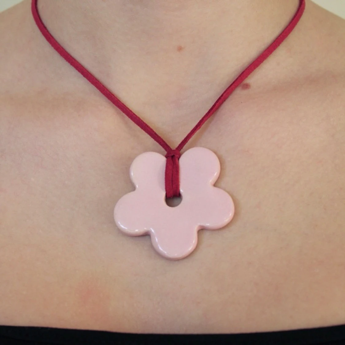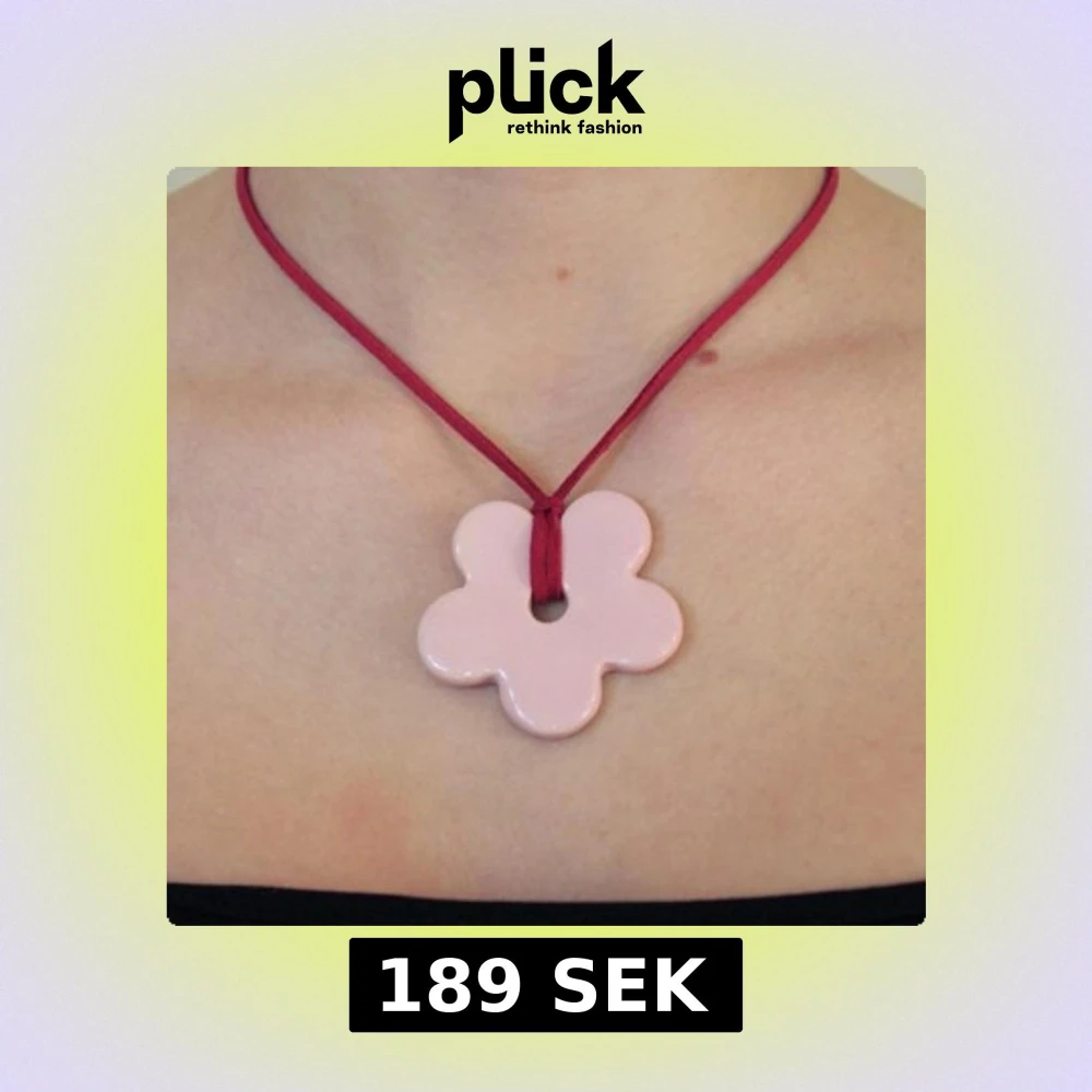 Halsband med en rosa blomformad berlock på ett rött band. Om önskas en annan färg tar vi emot beställningar i Instagram DM! @_vividuf