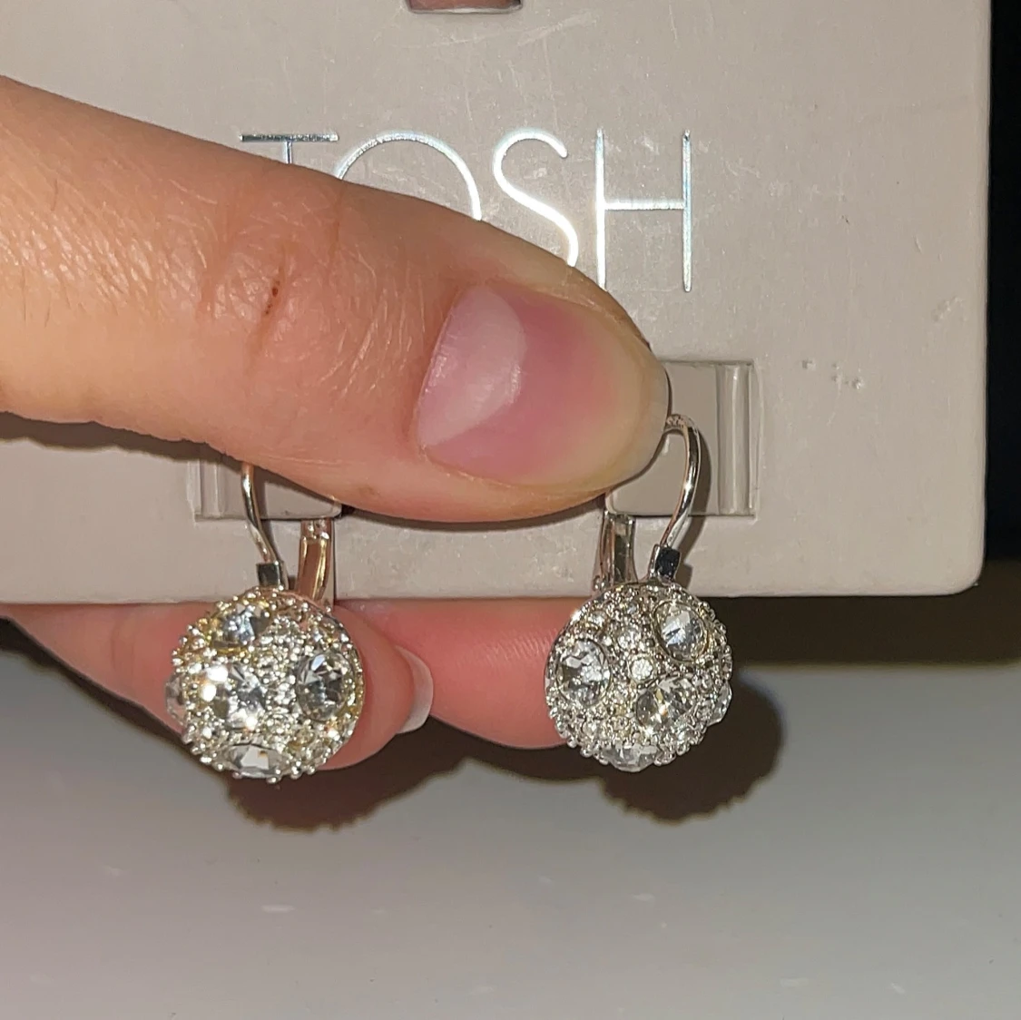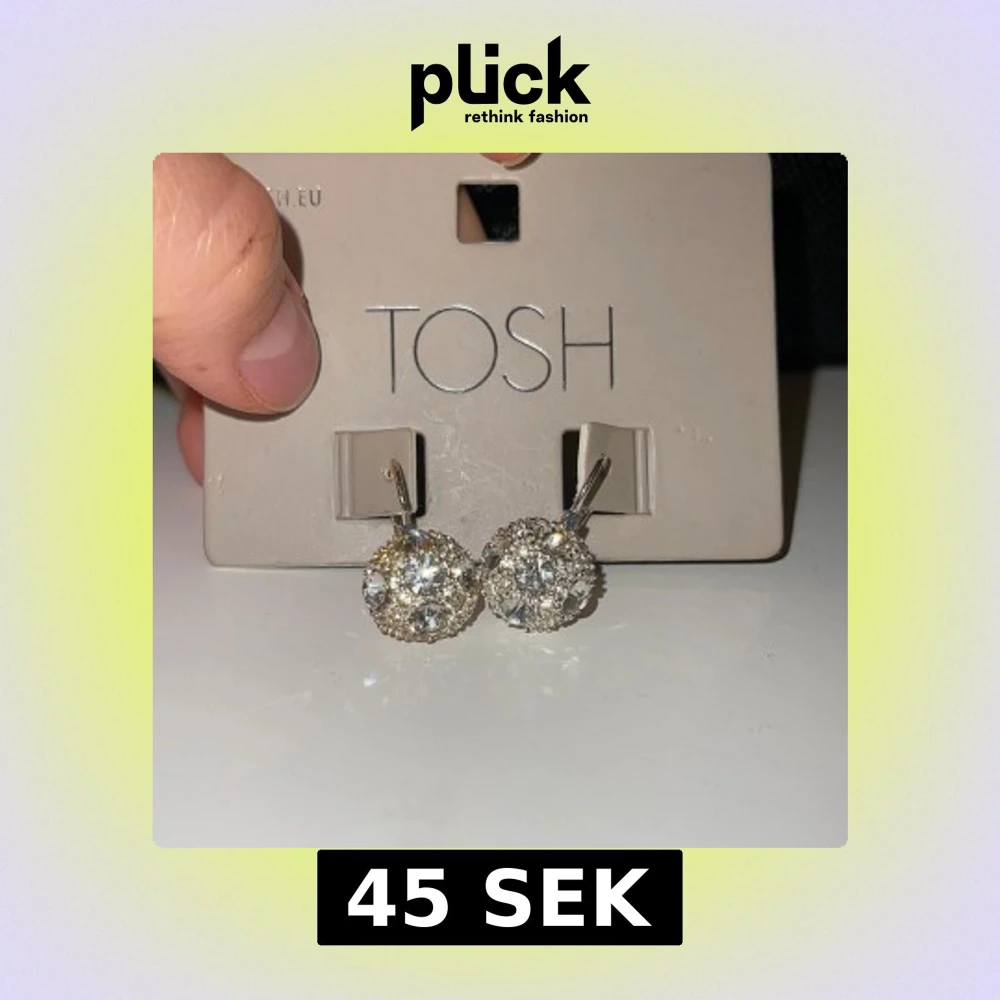 Säljer ett par runda örhängen från TOSH i silverfärg med massor av gnistrande stenar. De är klotformade och täckta av små och stora kristaller som ger en riktigt glittrig look. Perfekta för dig som vill sticka ut och addera extra bling till din outfit.