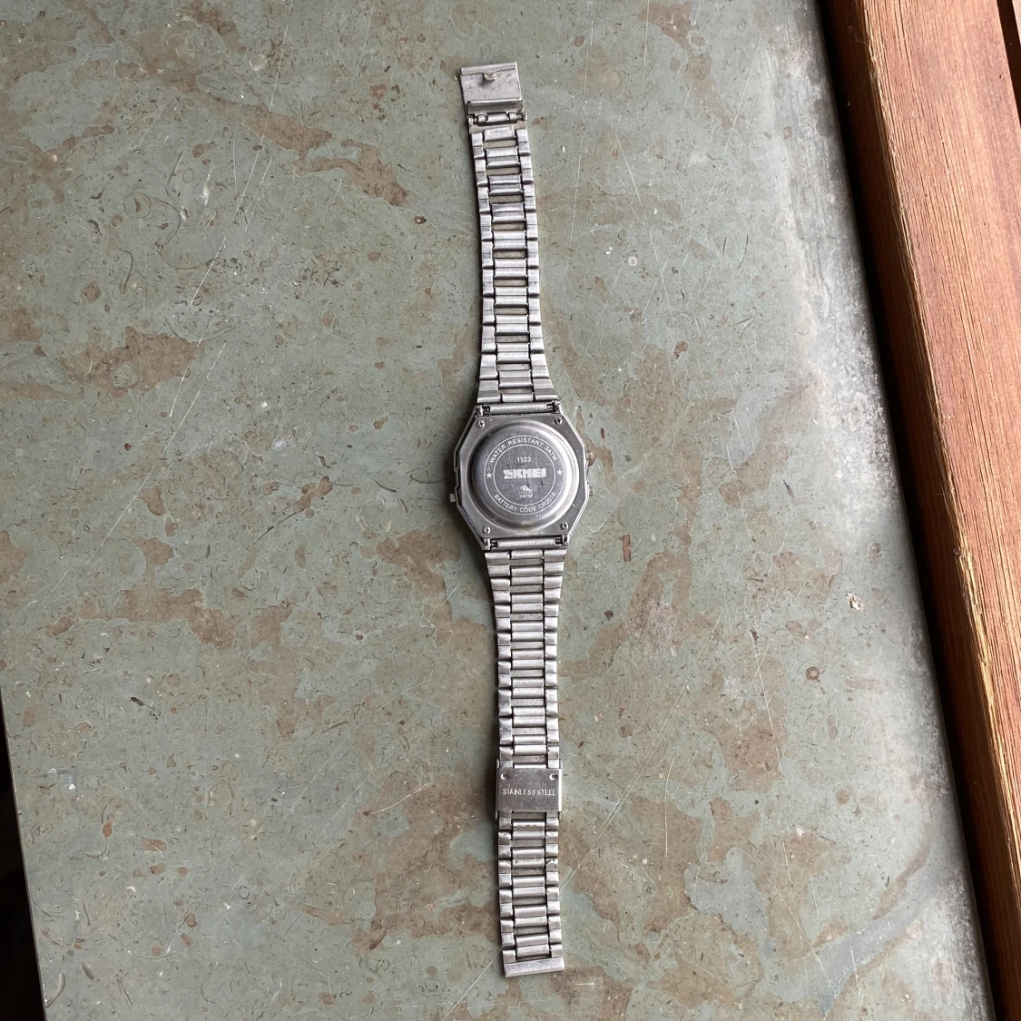 Digital klocka från Skmei med klassisk retrostil. Klockan har en fyrkantig display, alarm, kronograf och vattenskydd upp till 30 meter. Armbandet är i silverfärgad metall och har en stilren, tidlös look som passar till det mesta. Original pris 500kr typ