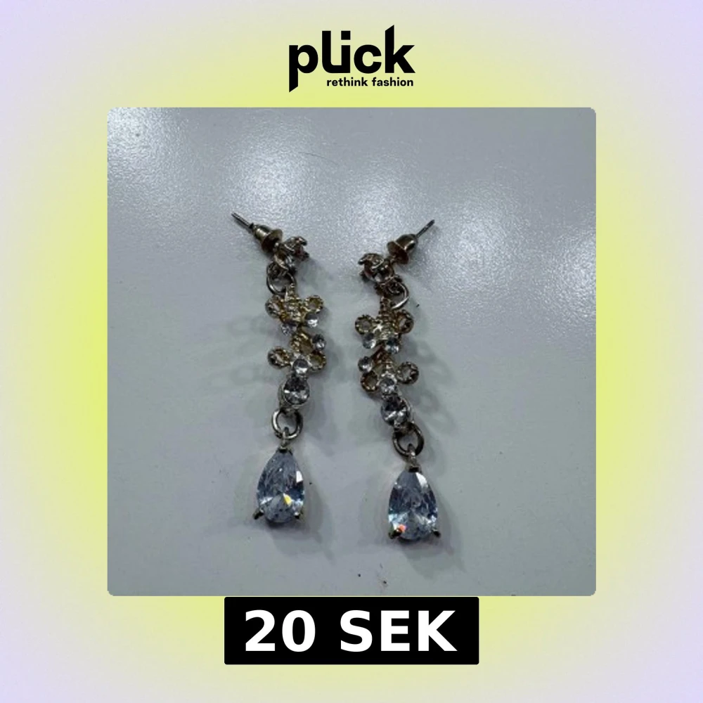 Säljer ett par eleganta örhängen i silverfärg med gnistrande stenar och droppformad kristall längst ner. Perfekta för att lyfta din look med extra glamour och stil.